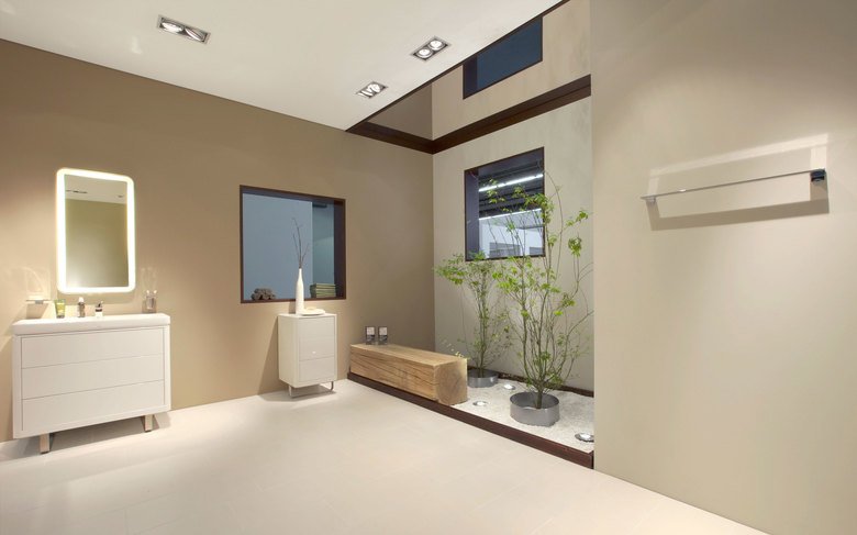 Kleine Gärten sind über den Stand verteilt und die Besucher können durch die Räume spazieren. Dabei gewähren die Fensterausschnitte verschieden Ein- und Ausblicke, die den Gebäuden Transparenz verleihen.
