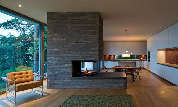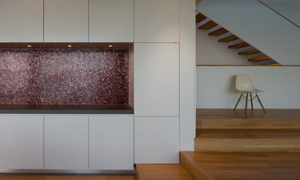 Im Innern verläuft der s-förmige Pfad von Eingang bis zum Seeanstoss. Seinen Windungen folgend, imitiert der Verlauf der Deckenhöhe den des Sees: Von 2.35m im Eingangsbereich bis hin zu 3.05 in der Küche. Die Innenwände sind in Valser Quarzit gehalten, die Böden in geölter Schweizer Eiche. Die Farben integrieren den Raum in seine natürliche Umgebung.