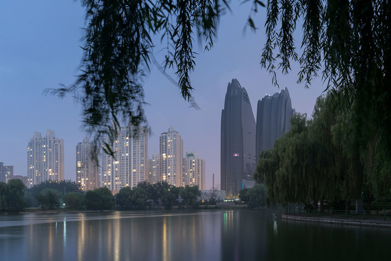 Inspired by traditional Chinese landscape paintings, the design remodels the relationship of large-scale architecture within our urban centers. It introduces natural forms and spaces ─ “mountain, brook, creek, rocks, valley and forest” ─ into the city. The asymmetrical twin tower office buildings on the north side of the site, sit at the base of the park’s lake and are like two mountain peaks growing out of the water. The transparent and bright atrium acts like a “drawstring” that pulls the two towers together by a connecting glass rooftop structure.