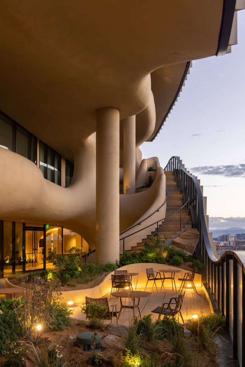 The soft surfaces of the Canyon—a carved-out, four-story amenity space inspired by natural erosion and designed to evoke a slot canyon, were designed by MAD to contrast the clean geometric lines of the building’s massing. This feature includes over 13,000 square feet of landscaped terraces that appear to hang in open space, offering some of the city's most breathtaking views, along with water elements that foster a strong connection between residents and the natural environment. The canyon-like structure running through the façade creates an immersive, natural experience, merging indoor and outdoor spaces and blurring the boundaries between nature and architecture.
