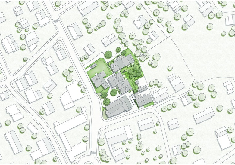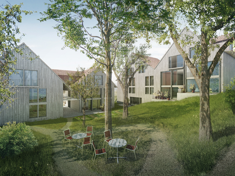 Ein historisches Ensemble aus Wohnhaus, Scheune, Gartenhalle und altem Obsthain wird umgenutzt und mit Wohnungen erweitert. Das Konzept sieht eine sanfte Integration der Wohnüberbauung in den durchgrünten Raum vor, der lauschige Ort soll seine Atmosphäre bewahren. Der Obsthain im gemeinschaftlichen Hof bleibt weitgehend erhalten. Alte Obstsorten und die grosszügige Wiesenfläche mit unterschiedlichen Ansaaten verleihen der Gestaltung einen hohen ökologischen Wert.
