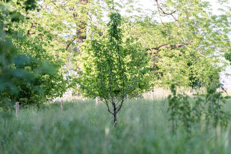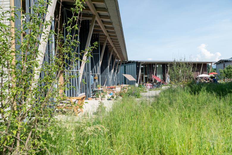 Baumgruppen und Solitärbäume gliedern die Freiräume, spenden Schatten, schaffen Sichtbezüge und räumliche Vielfalt. Einheimische, standortgerechte Laubbäume mit Nist- und Futterangeboten für die heimische Fauna und die grosszügige Wiesenflächen verleihen der Gestaltung, neben dem ästhetischen Aspekt, auch einen hohen ökologischen Wert. Eine Mischpflanzung aus mehrjährigen Stauden und sich selbst versamenden Ein- und Zwei-Jährigen bilden eine dynamische und zufällige Pflanzenkomposition, die sich über die Zeit verändert und sich wechselnden Voraussetzungen und Nutzungen anpasst („Blackbox-Gardening“). Unterhalb der Kuppe befindet sich in Hanglage der Gemeinschaftsgarten, welcher von den Bewohnern eigenständig bewirtschaftet wird.
