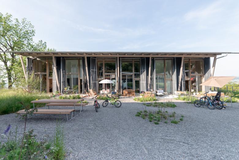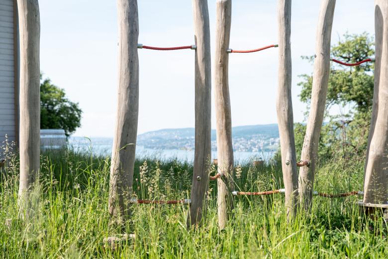 Eine Vorzone vor den Wohnungen bietet kleine Terrassen für die Bewohner, wobei die offene Gestaltung den Austausch untereinander fördert. Auf der Gebäuderückseite haben die Bewohner über einzelne Stufen den Zugang in die Landschaft. Ein Wasser-Sand-Spielbereich, ein Balancierparcours für kleinere und grössere Kinder und ein Nutzgarten für die Bewohner fügen sich natürlich in die vorhandene Topographie und Wiesenlandschaft ein und komplettieren das Angebot zur Bewegung und Begegnung.