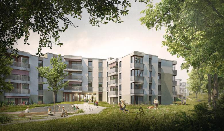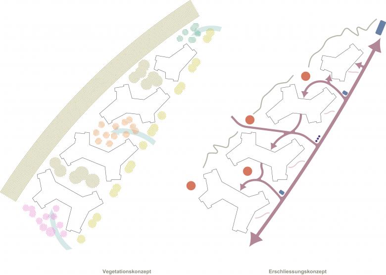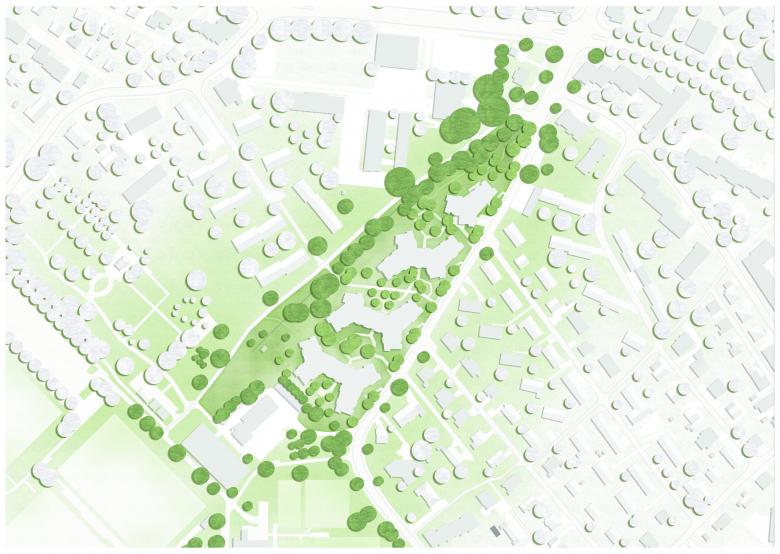 Die vorgeschlagene Setzung der neuen Gebäudevolumen führt die hohe Qualität des Bestandes weiter. Das Verhältnis von Baukörper und Freiraum ist aufeinander abgestimmt. Der Wohnpark zeichnet sich durch die sanfte topografische Gestaltung mit Wiesen- und Rasenflächen aus.