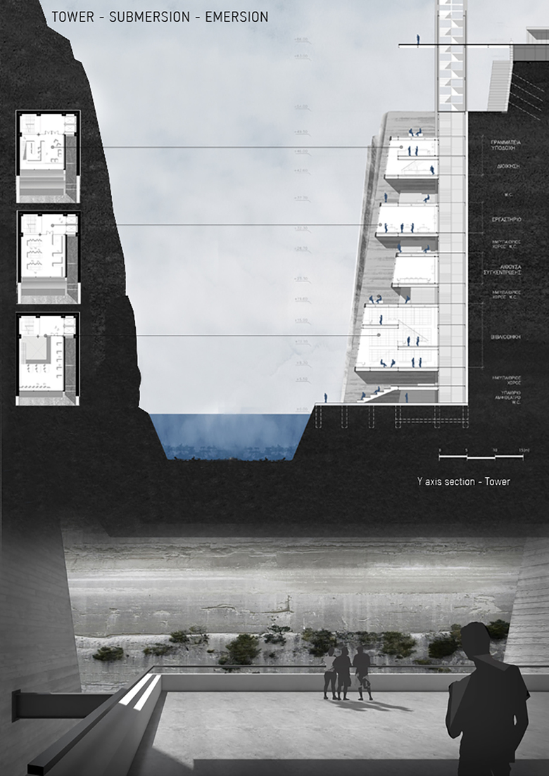 A "3 axes" analysis of the landscape was our basic tool in order to draw conclusions and give shape to our proposition. We considered as x axis the one parallel to the Canal axis and as y axis the transversal one which links the two banks. The z axis was very important, as well, because it's the one that links the upper ground level with the water level. Time, as a fourth dimension, is decoded and becomes the content of our intervention. Therefore, we aim to create a pole which concentrates a part of the unique experience of the Canal and gives the chance to the visitor to face its real dimensions and history. As a result, the visitor understands the essence of the landscape through an educative procedure based on observation and introspection. The proposition consists of three entities: a bridge as an exposition about the Canal (swing-link), a building as a museum about its history and geology (face to) and a tower as researchers' space (submersion-emersion). Each one confronts a different cartesian dimension of the three ones which are included in the canal. In this way, we create a network which allows people to experience the Canal's section on different levels and layers. This network is located at a critical spot in the Canal, at its highest point, and it has to face various constructional challenges linked to the Canal's particular morphology and geological consistence. At a larger scale, the project is anchored to existing uses and routes and it is part of a larger network which we design in the area in order to facilitate the access and to promote the exploration of the site and its surroundings. To conclude, this project proposes a strategic planning that does not concern only the local area. The past shows that Greece, despite facing an economic crisis, managed to co-ordinate with the revolutionary spirit of the industrial period and to cope with a great challenge, accomplishing both a great technical and economical feat. So, the proposal re-establishes the vision of a public project that could help Greek economy, while at the same time it would constitute a social, scientific and cultural pole.