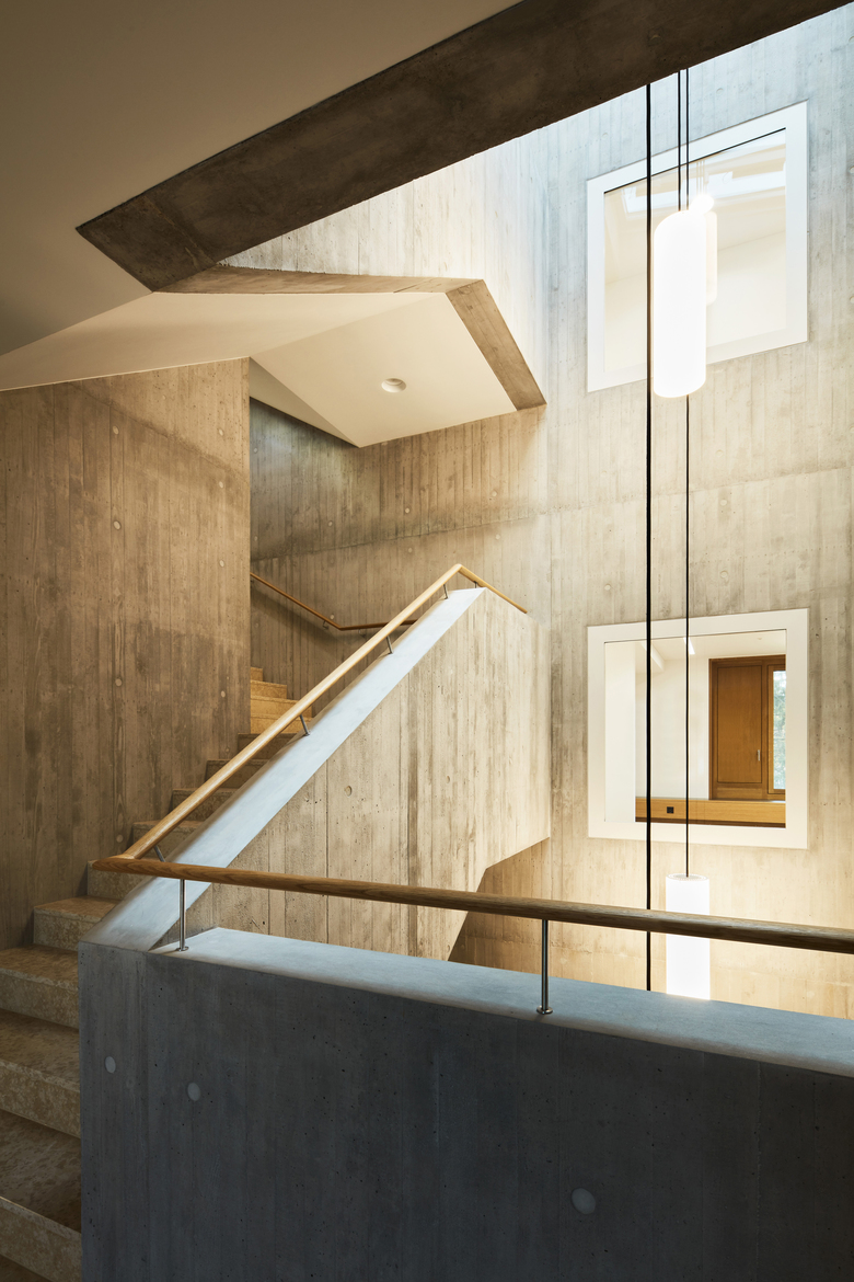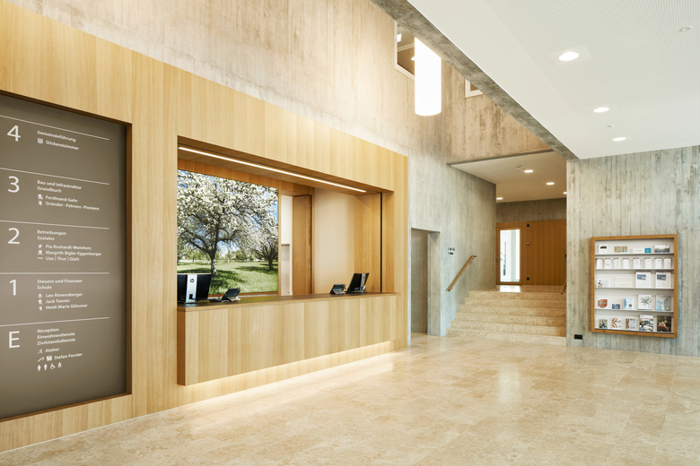 Im lichtdurchflutete Innenhof, dem Herzen des Gebäudes, schweben von uns entiwckelte Pendelleuchten. Sie bringen dem öffene Raum gleichzeitig Repräsentanz durch ihre Grösse und eine heitere Stimmung durch ihre brilliantes Licht.