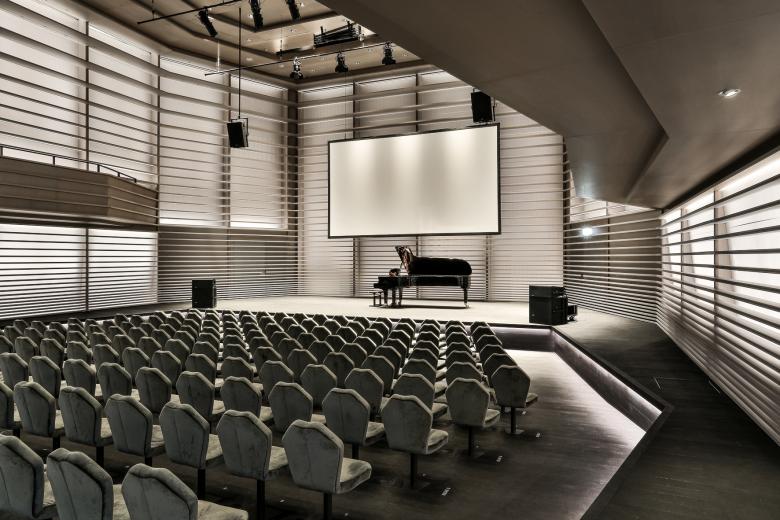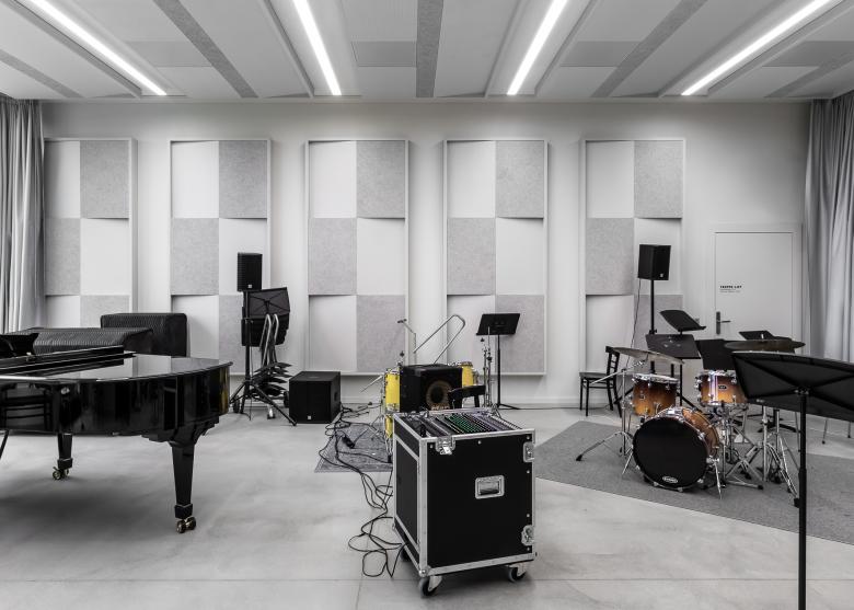 Das neue Gebäude bietet auf rund 8ʼ000 Quadratmetern flexibel nutzbare Räume, eine öffentliche Bibliothek, einen Club und einen Konzertsaal für 280 Gäste. Das Foyer als zentrales Gebäudeelement entwickelt sich kaskadenartig über alle Stockwerke und verbindet die verschiedenen Nutzungen miteinander. In der rippenartig strukturierten Betonuntersicht werden sowohl das Licht als auch die Akustik integriert. Die Lichtlinie als Grundbeleuchtungselement folgt parallel zur Rippenstruktur. Die Dichte der Lichtlinien reagiert auf die Art der Nutzung und der geforderten Beleuchtungsstärke. In den Arbeitsräumen sind die Lichtlinien mittig in der Fensterachse platziert und bilden das Gebäuderaster ab. Das Ziel einer geringen Anschlussleistung für die künstliche Beleuchtung bei sehr guter Farbwiedergabequalität wird durch die Verwendung von hochwertigen LED-Leuchten erreicht.