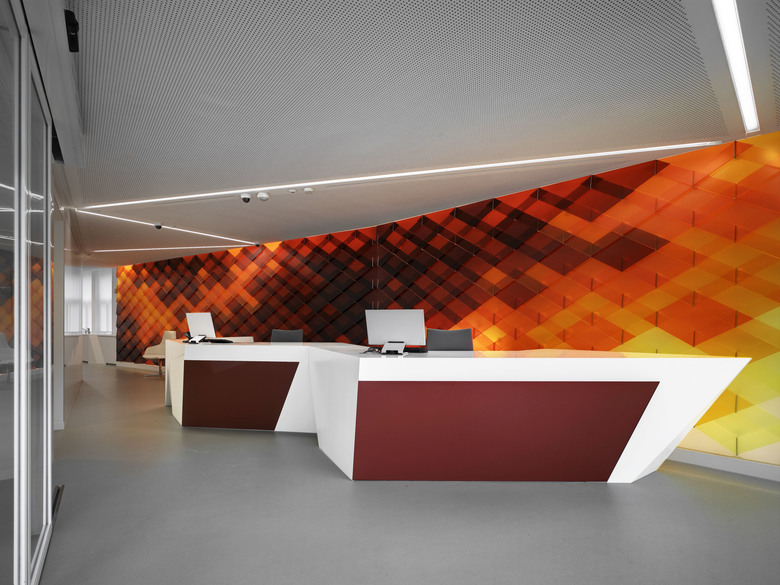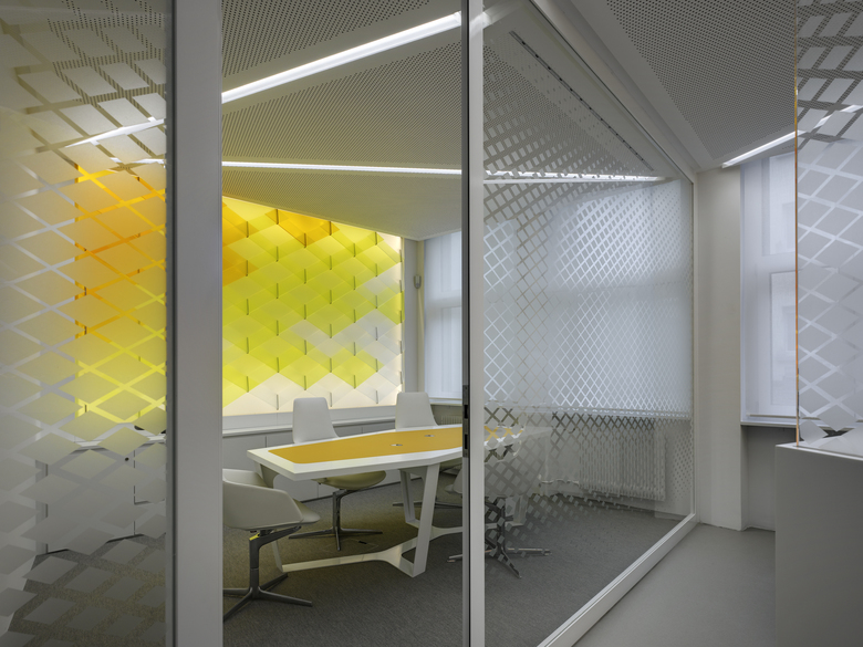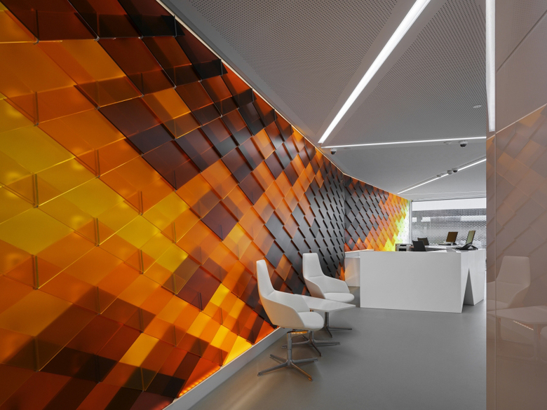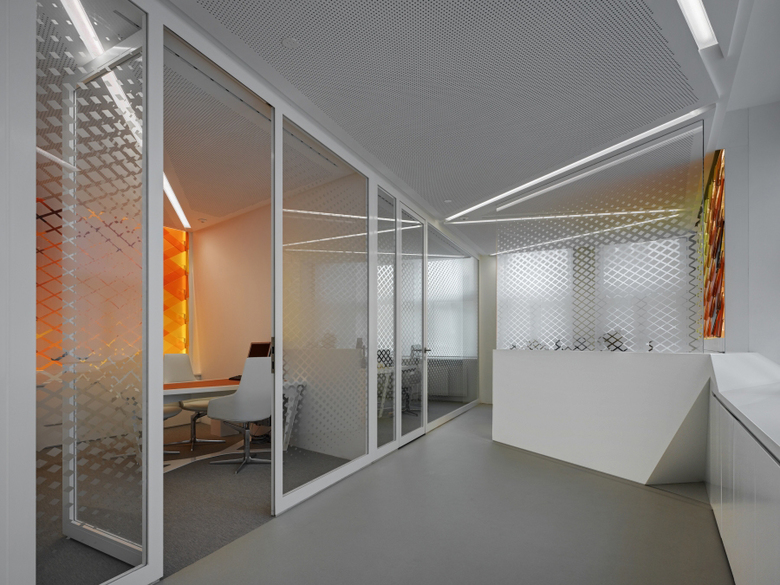 Die prononcierte Lichtführung unterstützt das offene Raumkonzept. Die klare Sprache der Lichtlinien spiegelt sich spielerisch in den Reflexionen der Glaswände und erweitert den engen Raum. Die präzisen Hinterleuchtungen der rautenförmigen Glasschindeln werden zu einem Farbtupfer in dem Gestaltungskonzept mit einer Neuinterpretation des ursprünglichen wabenartigen Banken-Logos.