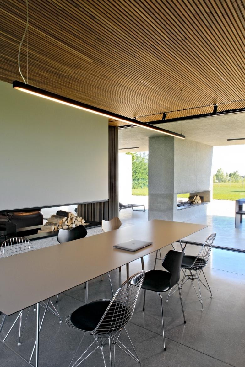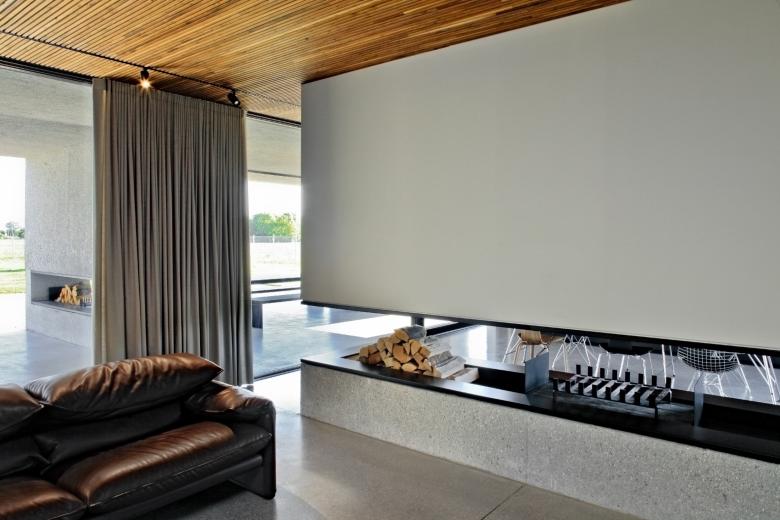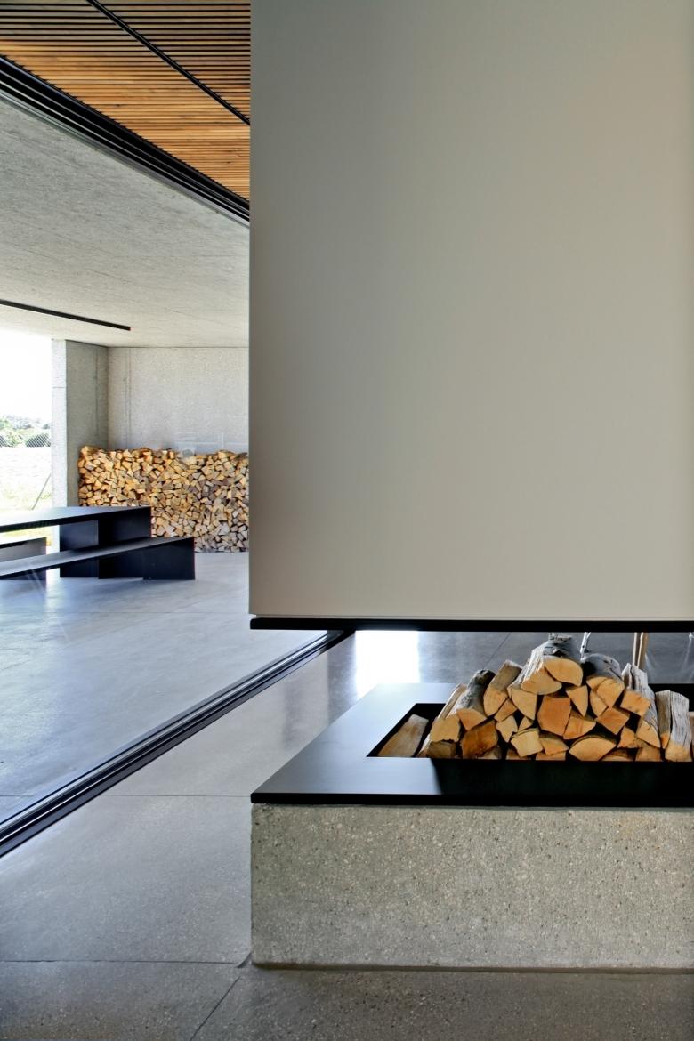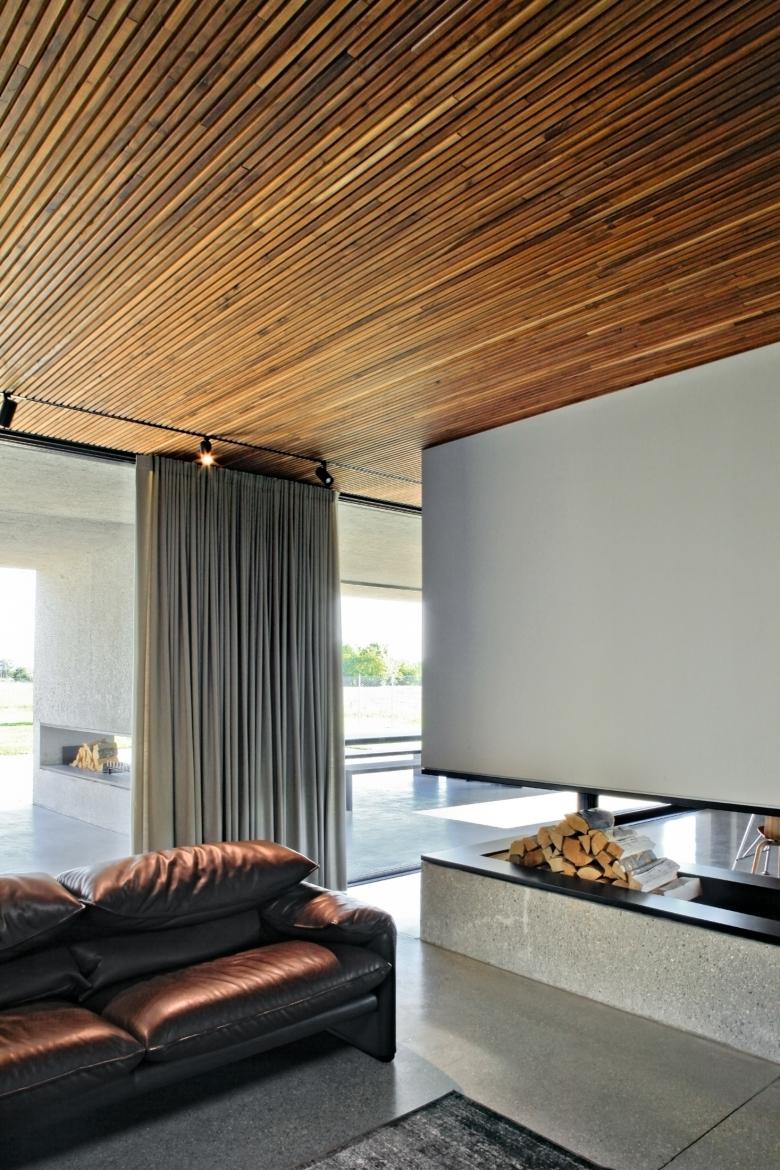 Nella zona nord-est trovano luogo i locali di servizio quali garage, lavanderia e bagno, mentre a ovest il living, composto da cucina e soggiorno, si estende all'esterno grazie alla presenza di un'area porticata.