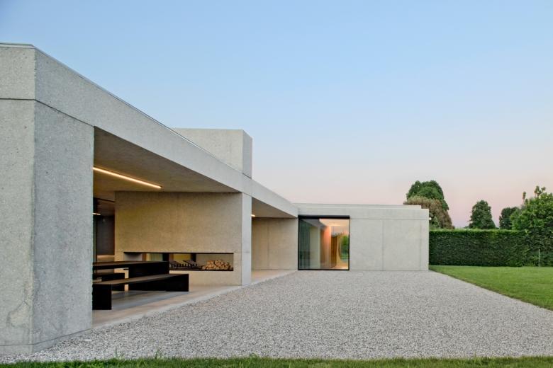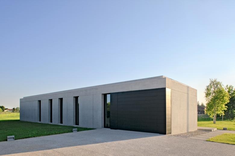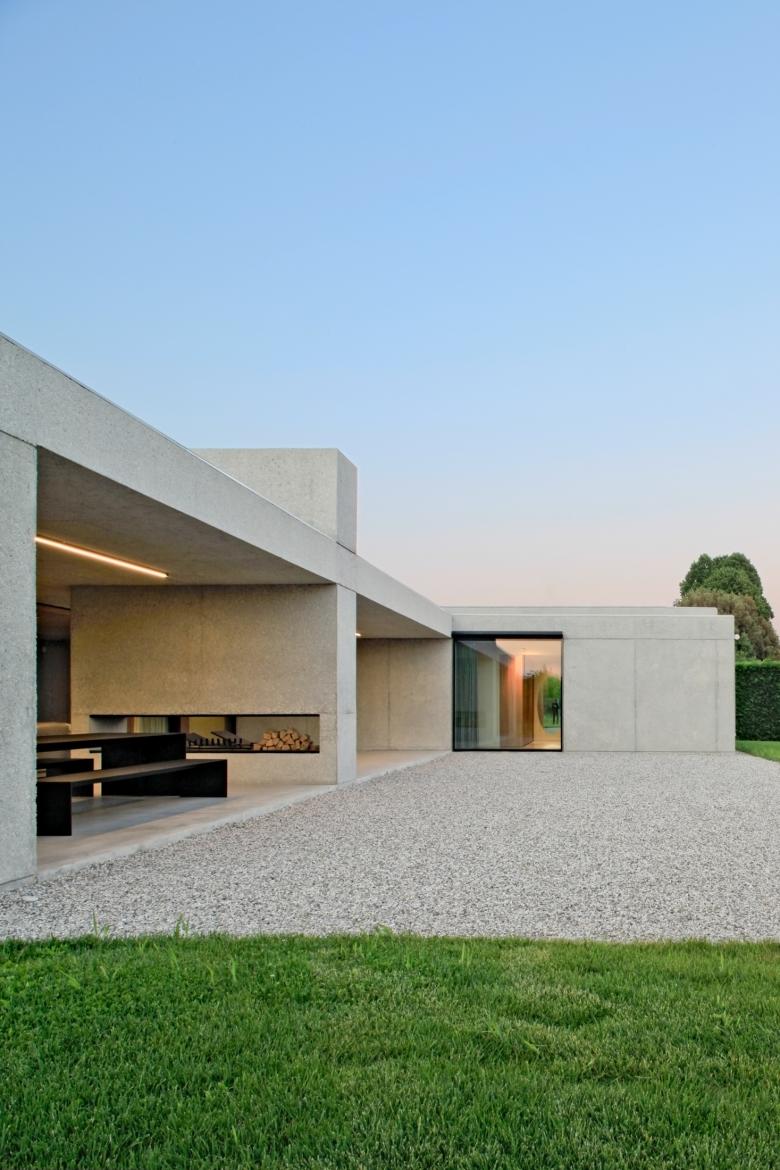 La forma dell'abitazione è generata dall'unione tra la disposizione funzionale degli ambienti interni e la loro migliore esposizione: si vengono così a creare due aree esterne con specifica proprietà di utilizzo e funzione, la zona sud a portico con ampie vetrate verso la campagna e la zona a nord chiusa e impermeabile verso la strada.