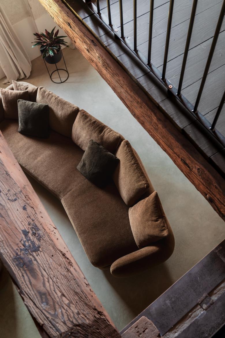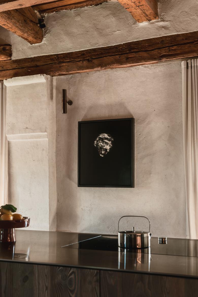 Una scala centrale conduce al soppalco, spazio ibrido tra studio e area relax, che si apre direttamente sull’abbaino della facciata principale. La pavimentazione in resina neutra, le travi lignee scure e gli intonaci restaurati definiscono un equilibrio materico misurato, in cui i volumi interni – volutamente più bassi delle travi – preservano la continuità dello spazio.
