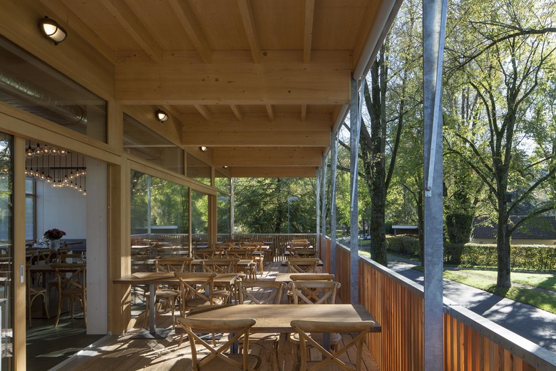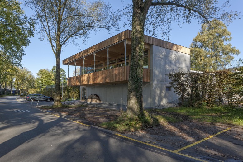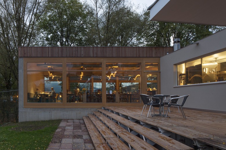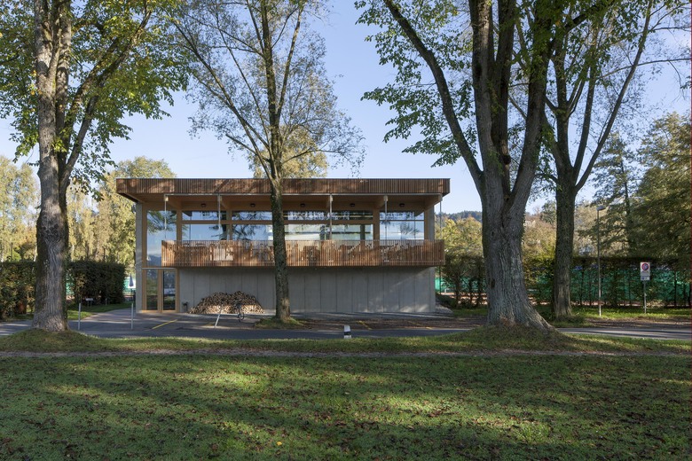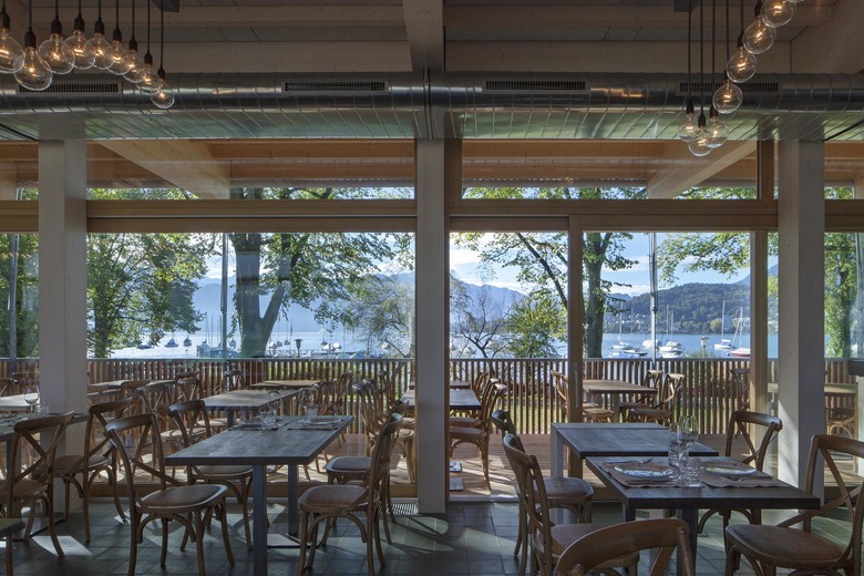 Das bestehende Clubhaus wurde um einen öffentlich ausgerichteten Restaurationsbetrieb erweitert. Der Bestand von 1984 wurde rückgebaut und es entstand ein neues Ensemble, das dem Clubhaus seine Eigenständigkeit lässt, sich davon abwendet und sich der Öffentlichkeit und dem See zuwendet. Um eine Zweiteilung des Gebäudes zu vermeiden, werden die bestehenden Elemente weiter geführt - auf der Westseite ist es der Betonsockel, auf der Ostseite die Glasfassade.