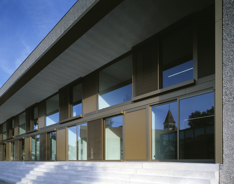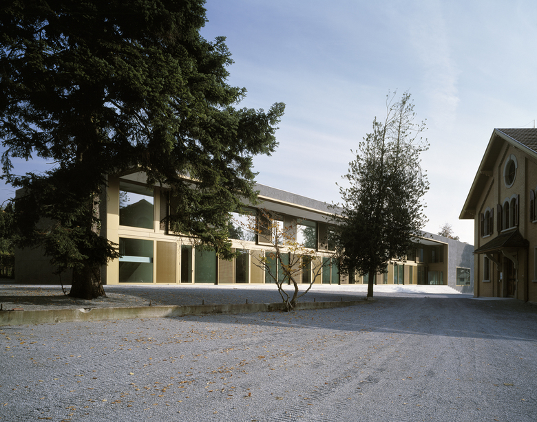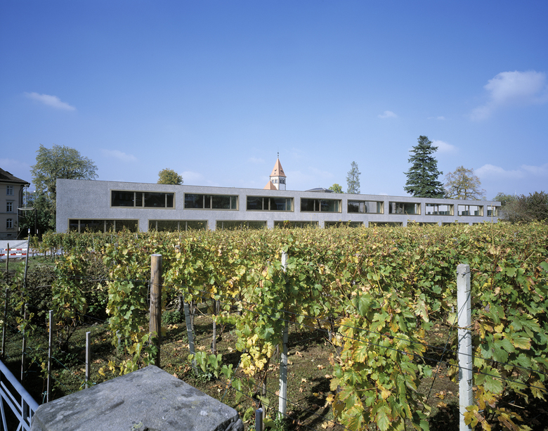 Die bestehende Anlage wird durch das Ensemble von Kirche und dem ihr angebauten Johanniterhaus dominiert. Südseitig grenzt der Rebberg, sozusagen ein geometrischer Park, an die historischen Gebäude. Der neue Unterrichtstrakt wird dort plaziert, wo der Übergang vom geome- trisch strengen Rebgelände zum parkähnlichen Schulareal stattfindet. Er trennt eine weite, ruhige und kontemplative Fläche von der Lebendigkeit des baumbestandenen Pausenplatzes. Das Haus ist zweigeschossig und ordnet sich der historischen Gebäudegruppe unter.