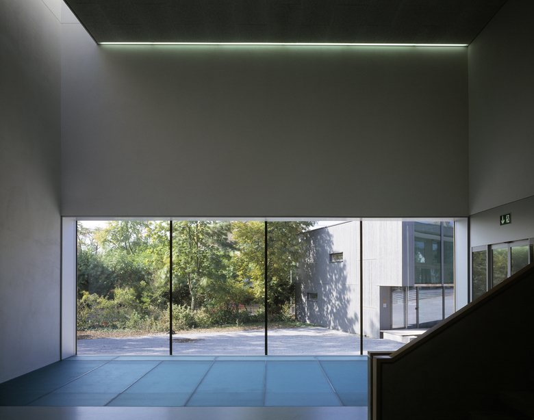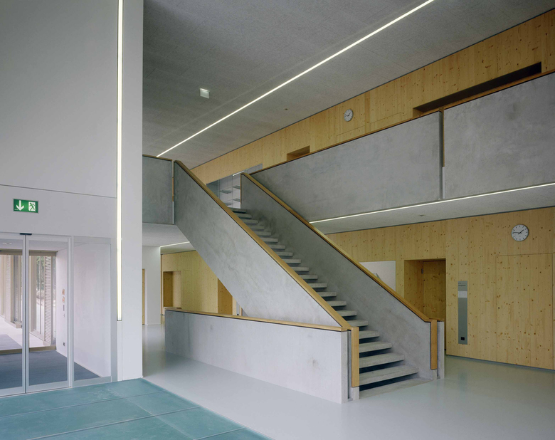 Eine gedeckte Vorzone ermöglicht Studium und Pausenaufenthalt im Freien. Der Zugang zum Gebäude erfolgt über den Platz und über eine Treppe, deren kontinuierliche Zunahme der Stufenanzahl das sanfte Gefälle des Geländes sichtbar werden lässt, in eine grosszügige zweigeschossige Eingangshalle.