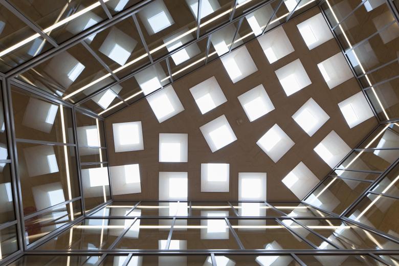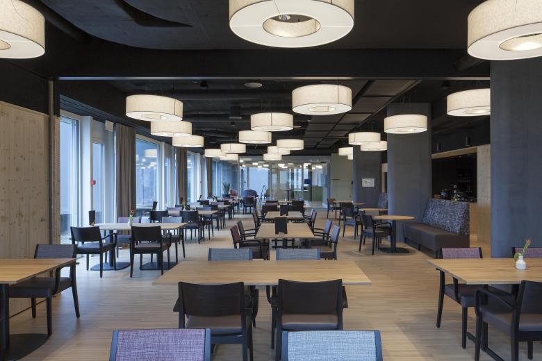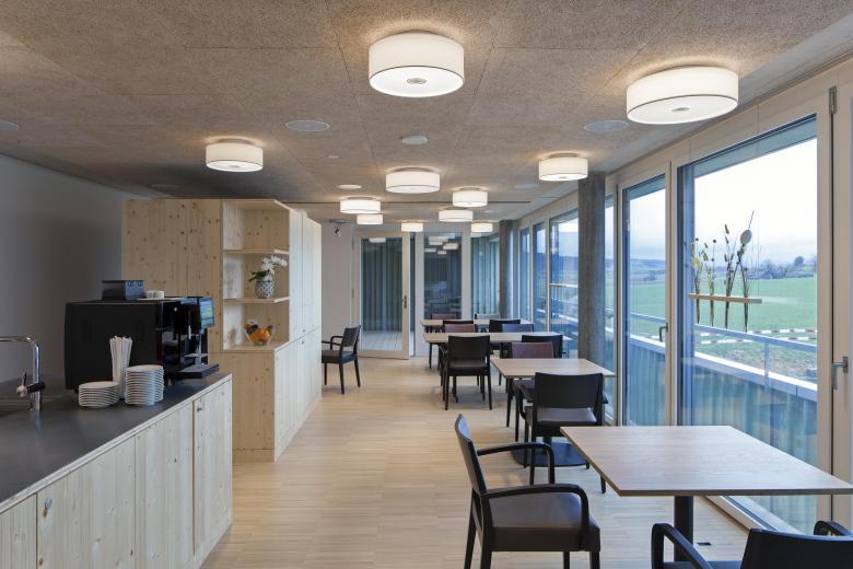 Eine dreigeschossige Halle ermöglicht den Überblick über das gesamte Gebäude. Im Erdgeschoss ist der Bestand mit dem Neubau verbunden. Cafeteria, Essaal und Aktivierung richten sich auf den Zugangsbereich und den Garten. Die direkte Anbindung der Küche an Cafeteria, Esssaal und Aktivierung ergibt eine optimale Nutzungsneutralität. Die Administration befindet sich in unmittelbarer Nähe zum Eingang.