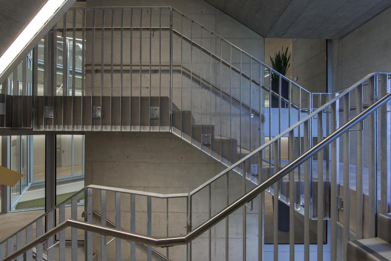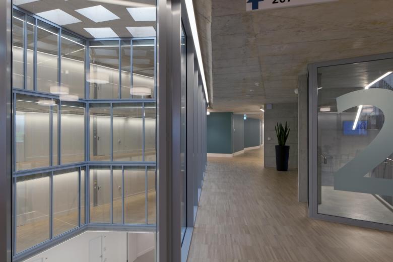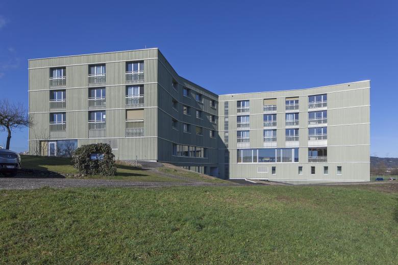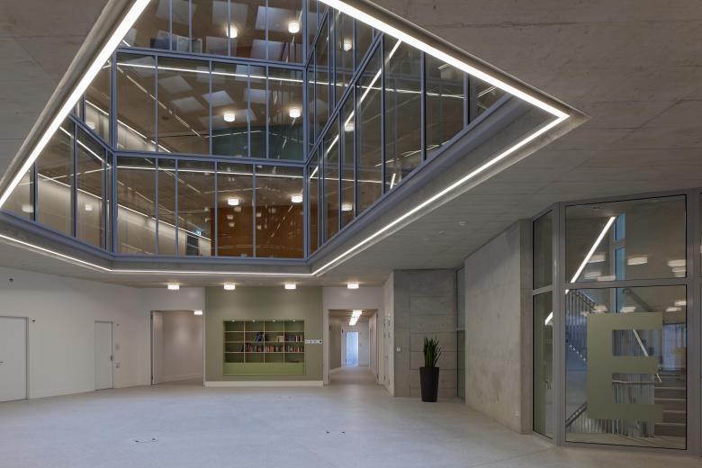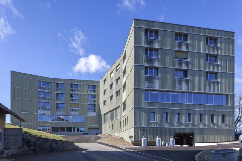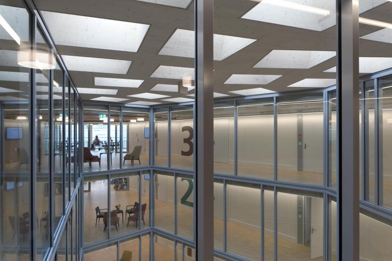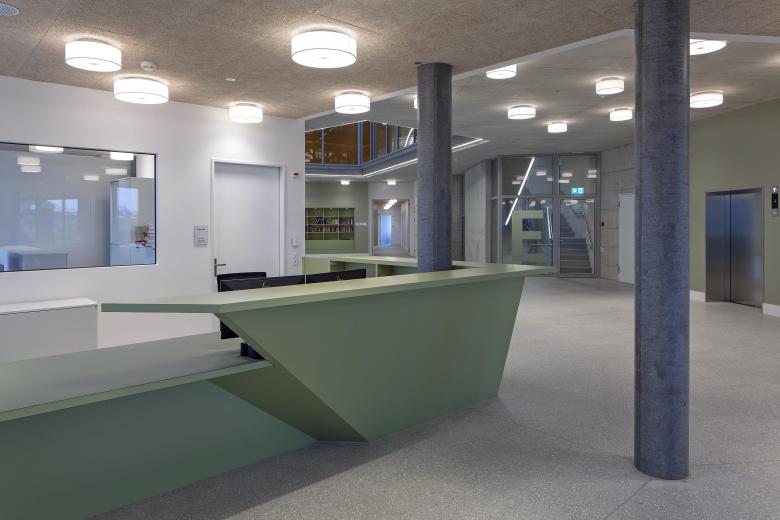 Es wird ein kompaktes 2-flügliges Volumen, leicht gegen Nordwesten abgedreht, an den Zugangsplatz gestellt. Die grosszügigen Platzverhältnisse im Mittelteil mit Lichthof lässt optimal nutzbare Zirkulations- und Aufenthaltsbereiche mit interessanten Aussichten zur Landschaft und in die andern Geschosse zu.