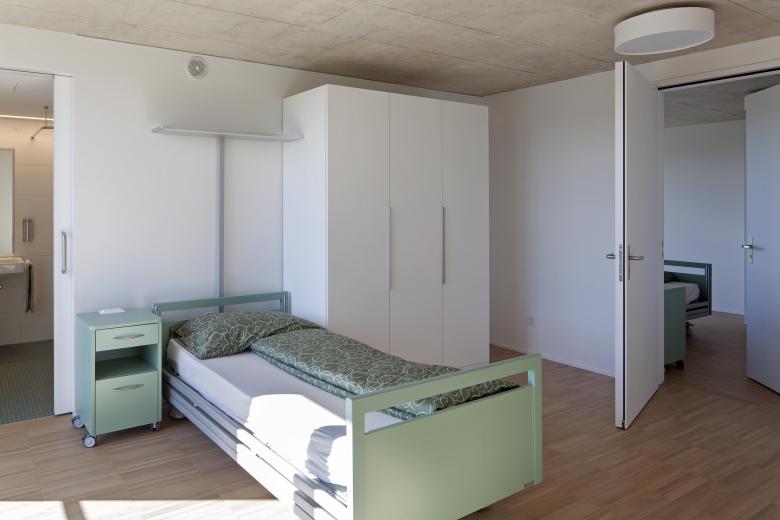 Die Nettofläche der Zimmer ist knapp bemessen. Sie sind deshalb als rechteckige Räume ausgelegt. Durch das Hintereinanderschalten der Nasszellen wird keine Vorraumsituation geschaffen, die unnützerweise Platz konsumiert. Der gesamte Raum steht zur neutralen Nutzung zur Verfügung. Die Raumabmessung ist so gewählt, dass Schränke und Betten überall platziert werden können. Ein drehbares Wandelement kann den Raum wahlweise zonieren.