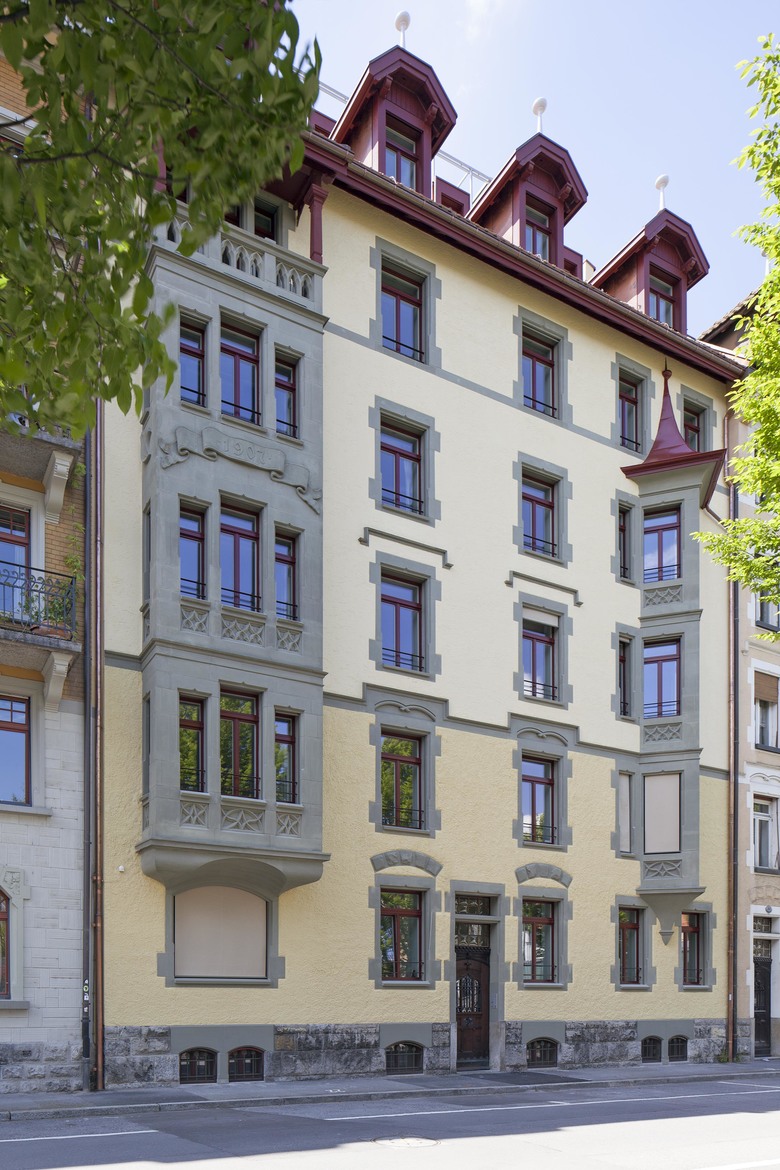 Im Innern hat das Jugendstil-Treppenhaus eine besondere Qualität. Die Wohnungsgrundrisse sind in ihrem Zuschnitt nutzungsneutral gehalten. Der Lifteinbau erfolgt an der Stelle, wo das Treppenhaus am wenigsten beeinträchtigt wird. Betreffend Wohnkomfort entspricht das hundertjährige Gebäude jedoch in vielen Punkten nicht mehr dem heutigen Standard. Zudem ist das Gebäude ohne Lift nicht behindertenkonform. Auf Grund dessen werden wir folgende bauliche Eingriffe vornehmen: