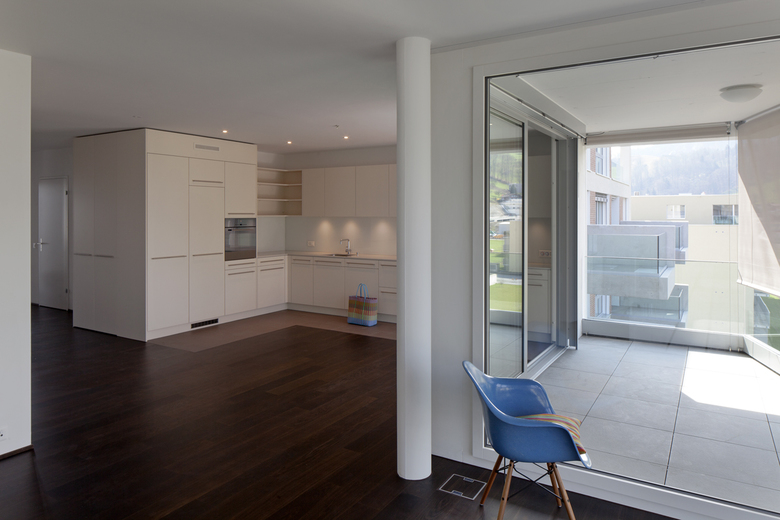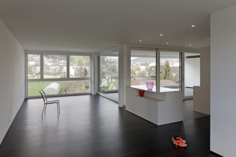 Die 30 Mietwohnungen in einem Mix von 21⁄2 Zimmer Wohnungen bis 51⁄2 Zimmer Wohnungen liegen entlang der Motelstrasse in Kriens und sind die 2. Etappe der bereits gebauten Siedlung Schellenmatt. Der Richtungswechsel wird mit einer leichten Grundrissverstaffelung veranschaulicht. Auch im Aufriss gibt es eine Verstaffelung, die den Übergang zu den angrenzenden Einfamilienhäusern schafft. Alle Wohnungen sind Ost-West durchorientiert. Den Wohn-Essbereichen sind eingezogene und ausgestülpte Aussenbereiche zugeordnet, Terrassen-Loggien; die einen zurückgezogenen Aufenthalt ermöglichen und gleichzeitig auch ein Austreten aus der Gebäudehülle auf eine Aussichtskanzel zur schönen Aussicht ermöglichen. Das äussere Erscheinungsbild orientiert sich an der ersten Etappe Schellenmatt, weist aber gleichzeitig einen eigenen Charakter auf. Zierelemente aus Flachverblendern in Backsteinoptik fassen die Fenster zu Bändern zusammen. Westseitig wird das Volumen fast zu einem Skelett aufgelöst - ostseitig bleibt die Fassade geschlossener.