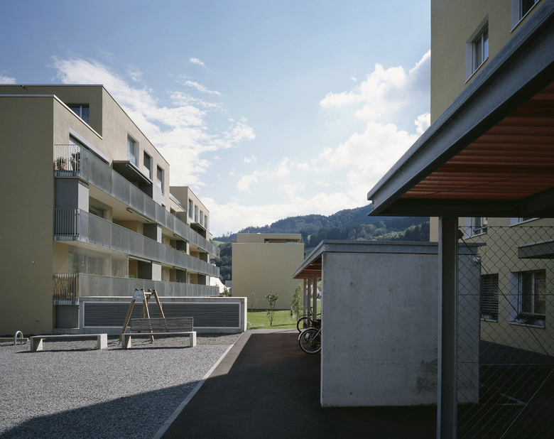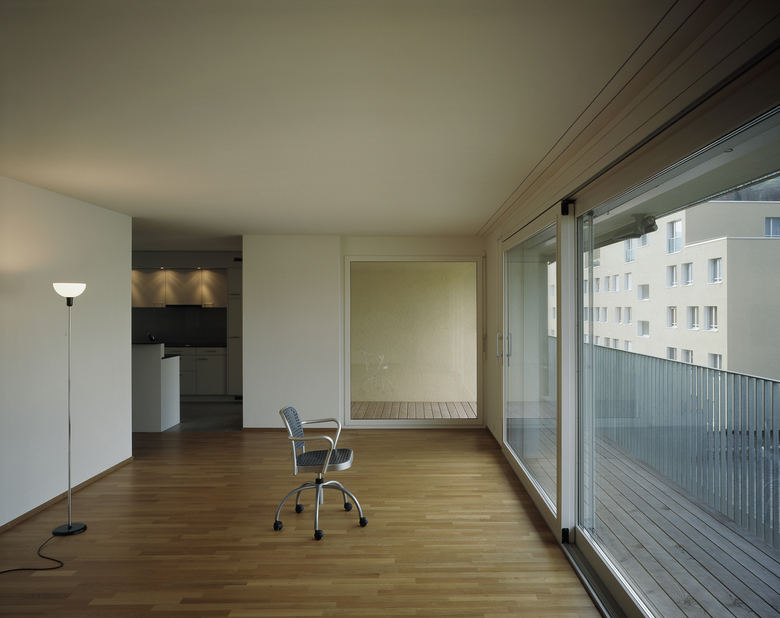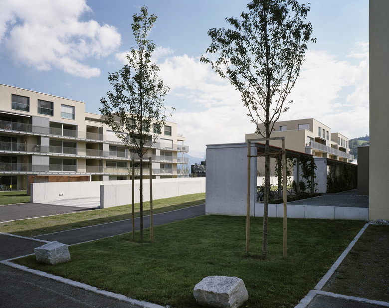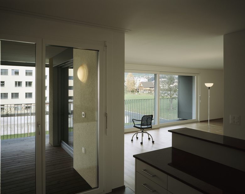 Gegen Westen sind alle Fenster raumhoch, gegen Osten verfügen sie über eine Brüstung. Die im Erdgeschoss gelegenen Wohnungen sind gegenüber dem Aussenraum leicht erhöht. Somit ist die Privatheit nicht beeinträchtigt. Trotzdem ist ein Gartenzugang mittels einer klei- nen Differenztreppe möglich.