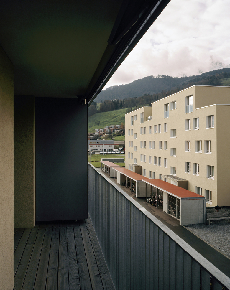 Westseitig wird allen Wohnungen ein Deck vorgeschaltet, das den Innenräumen einen Vordergrund und eine Grosszügigkeit nach Aussen vermitteln. Diese Decks weiten sich zu eigentlichen „Aussenzimmern“ aus, die als Veranda oder als offene Terrasse gestaltet werden können. Die Terrasse liegen geschützt beim eigenen Wohnbereich. Immissionen von den Nachbarn sind minimiert.