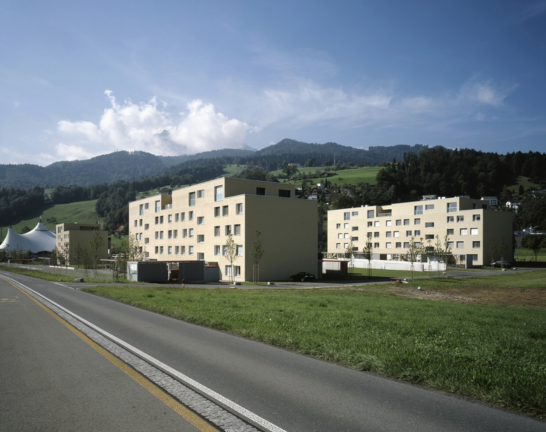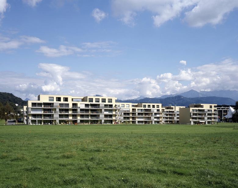 Das Gebiet Schellenmatt be ndet sich seit der Überdeckung der Autobahn an aussichtsteicher, gut besonnter und ruhiger Lage. Die Hauptaussichtsrichtungen sind der Blick auf den Pilatus im Südwesten und die Weitsicht auf die Innerschweizer Berge im Osten. Auf diese Situierung reagieren auch die Wohnungen - sie sind Ost-West orientiert. Am Fusse des Pilatus gelegen weist das Gebiet eine typische, voralpine und trotzdem stadtnahe Lage auf. Das „Wohnen im Grünen“ ist ein wich- tiger Bestandteil des Entwurfes. Durch die verstaffelte Anordnung der Gebäude fliesst der Aussenraum durch die Siedlung weiter. Die Umgebung eines jeden Gebäudes ist das Grüne - der ländliche Charakter bleibt erhalten. Das Naherholungsgebiet liegt direkt vor der Haustüre. Die Überdeckung der Autobahn erzeugt entlang der geasmten östlichen Arealgrenze einen etwa 70 Meter breiten Grüngürtel, der nicht bebaubar ist und nur durch die Motelstrasse in Längsrichtung durch- fahren wird.