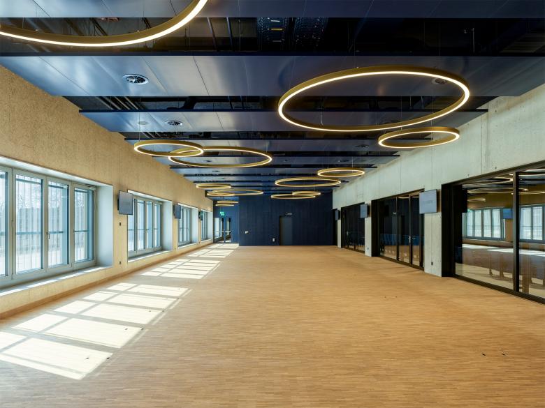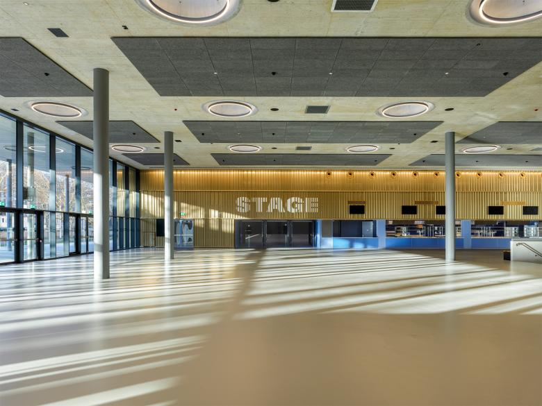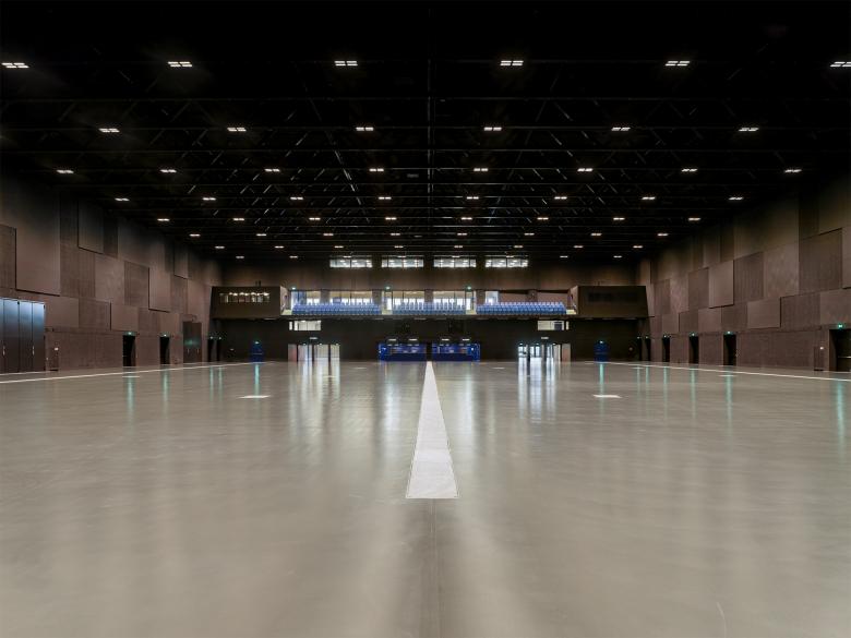Der Neubau ist eine auf Anhieb lesbare Einheit aus drei Teilen. Eventhalle und Kongress als unabhängig nutzbare, aufs Wesentliche reduzierte Volumen werden zusammengebunden durch eine einladende und Schutz bietende Laubenhalle, in welcher das gemeinsame Foyer integriert ist. Die grosszügige Laubenhalle verankert das neue Kongress- und Eventcenter und den ganzen Ort besser im Quartier, im Stadtgefüge und im städtischen Leben. Das der Laubenhalle eingeschobene Foyer mit hohem öffentlichem Charakter ist der künftige Hauptankunftsort und Zugang zum Messegelände. Es verbindet und trennt gleichzeitig die beiden unterschiedlichen Nutzungen von Kongresszentrum und Eventhalle. Die Baukörper selbst weisen eine homogene Haut mit unterschiedlichen Graden an Transparenz auf.