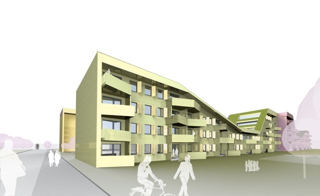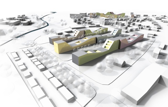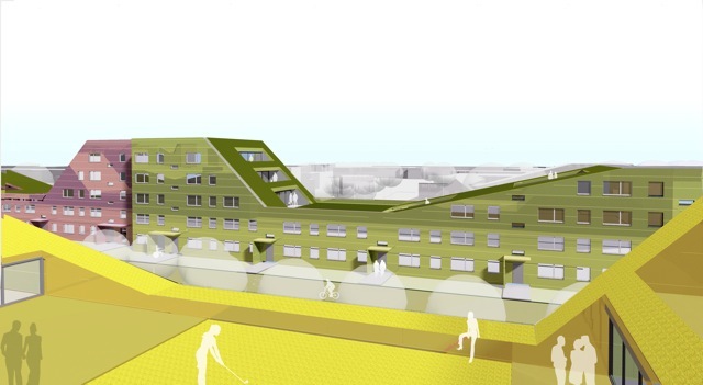 Die neue Kontur ist flexibel anlegbar je nach gewünschtem und erforderlichem Raumvolumen des jeweiligen Blocks, d.h. die Dachneigung steht in Abhängigkeit zur minimalen und maximalen Geschossigkeit des Bestandsbaus - konstruktiv berücksichtigt werden hierbei die tragenden Querachsen und Treppenhauspositionen. Das Prinzip besteht darin, in den Hochpunkten der Häuser Lifte für die Erschliessung vieler Wohnungen zu organisieren, während die zwei- oder dreigeschossigen Gebäudeteile selbstverständlicher ohne Aufzug auskommen und die erdgeschossigen Wohnungen überwiegend den Bonus der ebenerdigen Erreichbarkeit bieten. Die Dachlandschaft offeriert das Modell Terrassenhaus, bildet Fläche für eine Dachbegrünung im Sinne der aktiven Nutzung, ökologischen Ausgleichsfläche und optischen Attraktivität, zusätzlich werden Solarpaneele unkompliziert eingebunden.