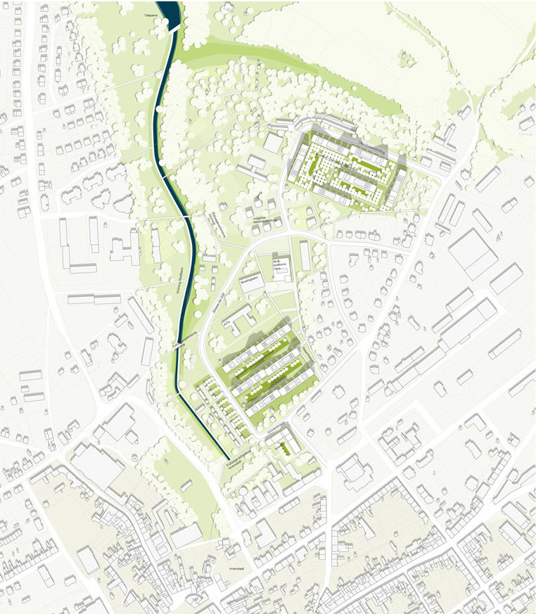 Das Siedlungsgebiet Otto-Grotewohl-Ring / Rötlein ist durch seine Hanglage mit eindrucksvollem Geländeverlauf, sowie dem angrenzenden übergeordneten Grünzug Stadtbach geprägt. Der arkadische Landschaftsraum des Stadtbaches mit seinem lockeren Baumbestand verbindet sich mit der, in einer Senke gelegenen, gemeinschaftlichen Mitte und deren eingestreuten Sonderbauten. Auf den Kuppen, an die gemeinschaftliche Mitte anschließend, werden die Wohnquartiere akropolisartig - zu einem Plateau mit skulpturhaften Setzungen entwickelt. Ein ruhiger grüner Rahmen ergänzt die prägnante Architektur. Bestehende Wegeverbindungen zum Grünzug sowie zur Innenstadt werden gestärkt und durch neue, sinnvolle Verbindungen ergänzt. Die beiden Wohnquartiere werden durch ihre erhöhte Lage als eigenständige, grüne Plateaus entwickelt.