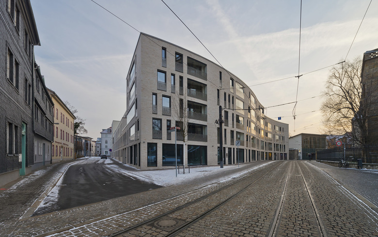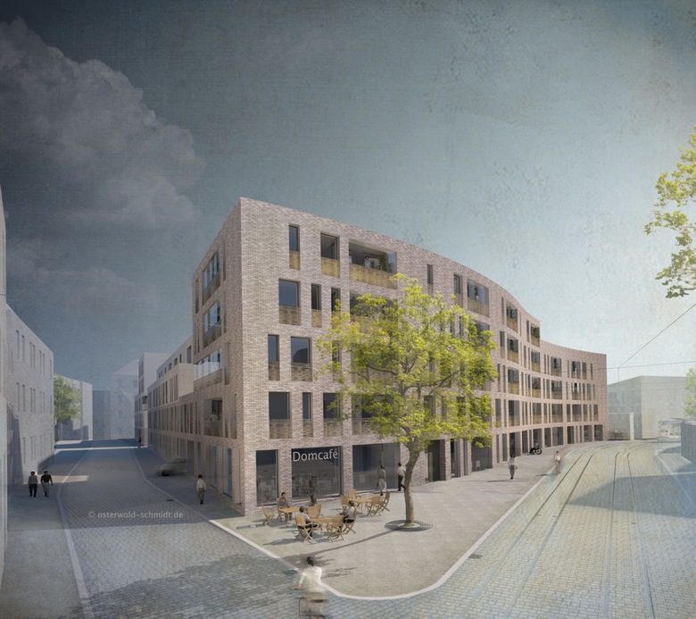 Langlebige, widerstandsfähige Materialien mit optischer und haptischer Ästhetik, wie z.B. Klinkersteine und mineralischer Kratzputz, sollen im Verhältnis der Live-Cycle-Cost-Betrachtung die Beständigkeit der neuen Bebauung langfristig unterstützen und in unmittelbarer Nähe zum mächtigen Dom das neue Quartier auch selbstbewusst und vereinend behaupten. Das Wechselspiel mit filigranen Verglasungen und subtil verlaufenden Materialperforierungen sollen die Übergänge vom urbanen Umfeld zu „weichen“ privaten Bereichen mit Raum für viel Individualität unterstützen.