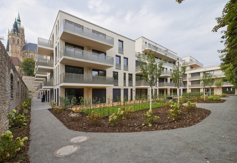 Durch einen halböffentlichen Zugang in der Mitte des Flügels am Domplatz kann der Innenhof betreten werden. Eine Mittelerschließung wird flankiert von Kulissengärten (Staudenbeete mit linear gepflanzten, dekorativen Ziersträuchern), die die privaten Loggien und Terrassen der Erdgeschosswohnungen in lockerer, rhythmischer Abfolge von der halböffentlichen Hofmitte abschirmen. Der offene Hofmittelpunkt dient als Tre punkt der Anwohner und halbö entliche Erschließung der südlichen Gebäudeflügel zugleich.