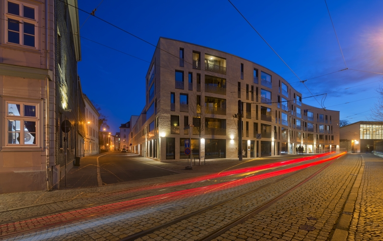 Der S-Schwung des Gebäudes erö net Vis-a-Vis zum Dom einen Freiraum für gastronomische Freiluft-Aktivitäten und verzahnt den Neubau mit dem Erfurter Domplatz.