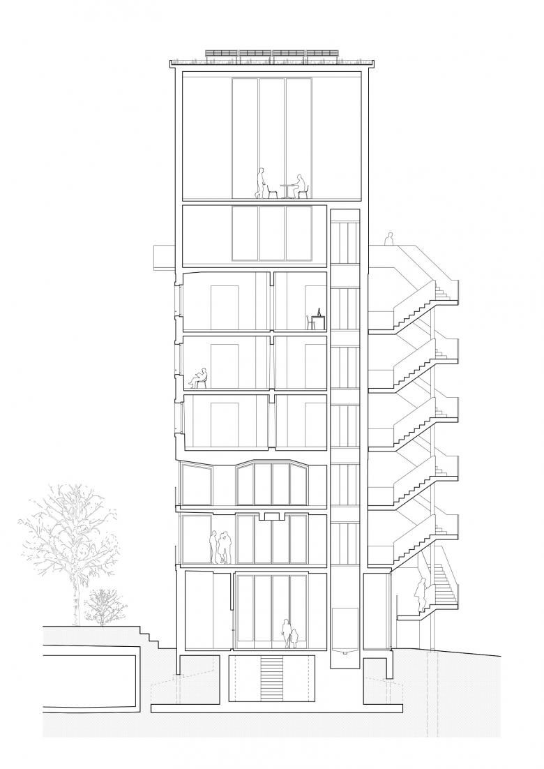 Die fast schon ikonografische Figur des Bestandes wird auf der Süd-Ostfassade mit einer massiven Aussentreppe aus Ortbeton und Metallgeländerscheiben erweitert, die der Erschliessung des Gebäudes dient. Dabei entstehen zusätzliche Vorzonen und Balkone, welche den Platzraum in der Vertikalen erweitern. Eine Liftanlage wird in das Volumen integriert und dank eines Innendämmkonzeptes können die Eingriffe an der bestehenden Fassade aus Sichtbeton, Zementputz und Klinker im Erdgeschoss auf ein Minimum beschränkt werden.