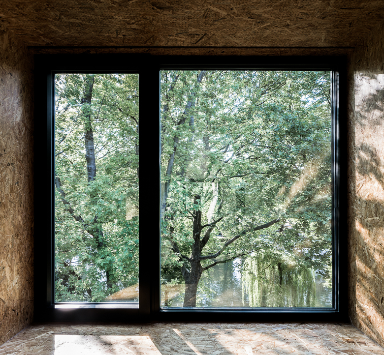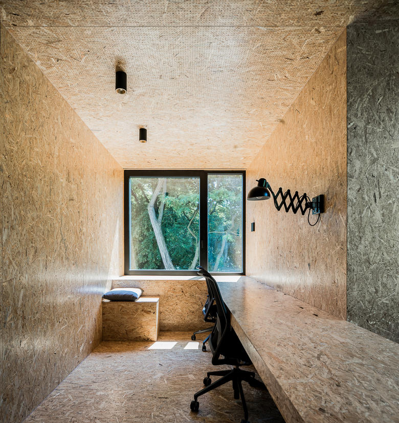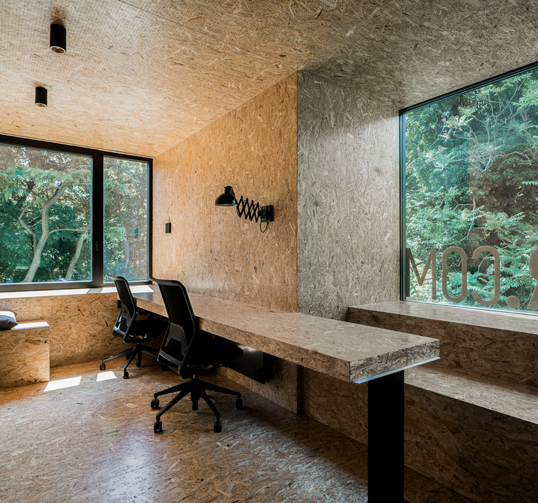 Im Inneren ist der Raum hinsichtlich seiner Sitz- und Arbeitsmöglichkeiten bewusst so gestaltet, dass er flexibel für verschiedene Zwecke genutzt werden kann. Er ist Ideenwerkstatt, Besprechungsraum und Ruheort zugleich. Boden, Decke, Wände, Tisch, jedes Möbelstück in dem Raum ist aus OSB-Platten gefertigt, einem sehr einfachen aber echten Material. Man betritt ein ganz ruhiges Raumvolumen, das nur durch den Raum wirkt, wie eine Skulptur, aus einem Material gefertigt.