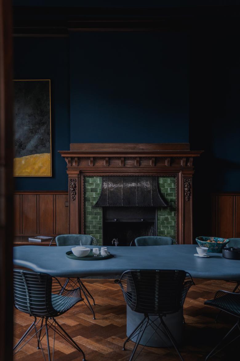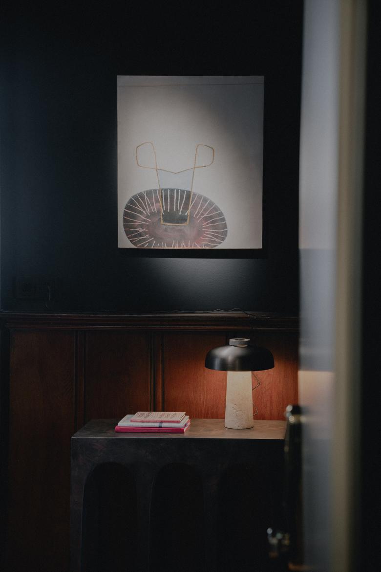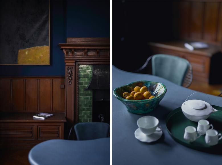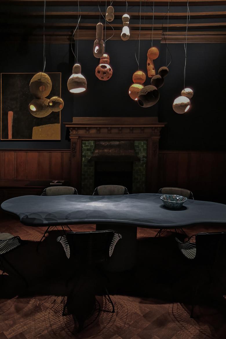 The interior design is characterised by precisely selected furniture and lighting elements, which are complemented by unique art objects. The highlight is the luminaire jointly realised by studio 638, PSLab and Philipp Architekten in one of the two meeting rooms: UFO-like objects hover above the amorphous table and bathe the night-blue-painted room in breathtaking light.