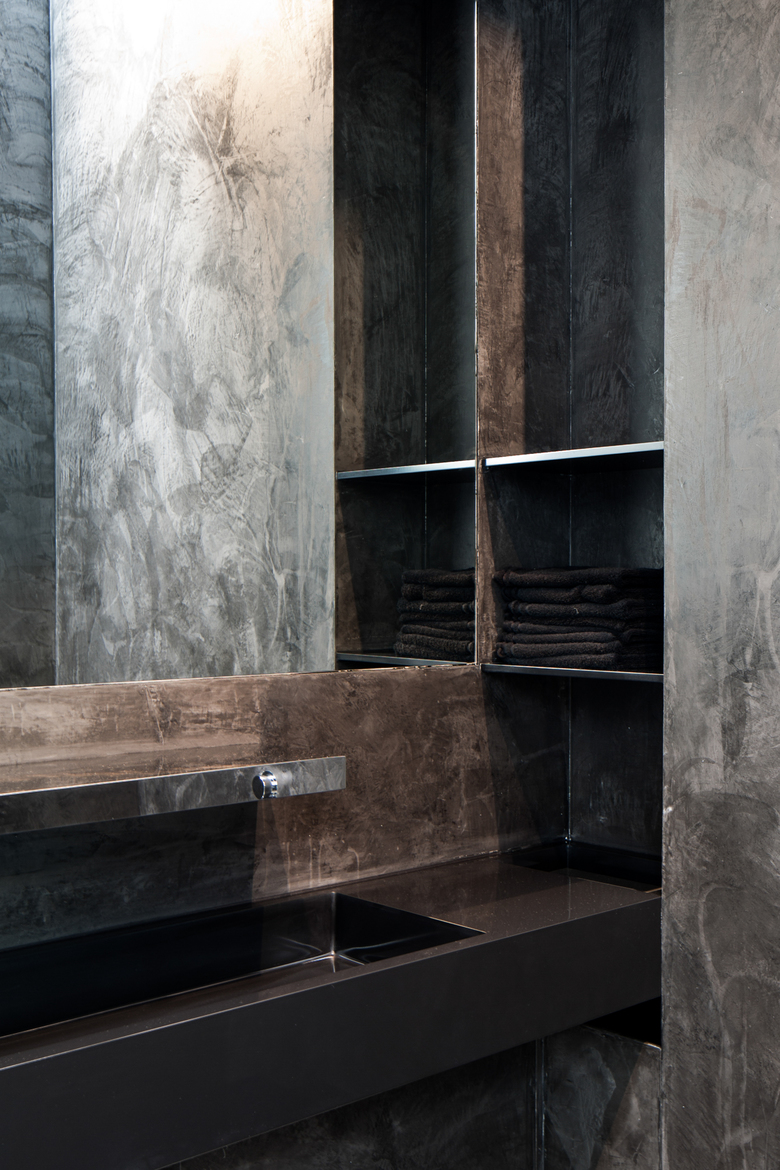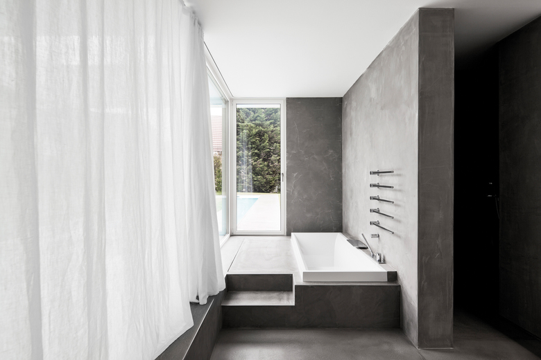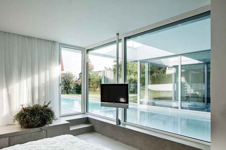 Der eigenwillig in die Fassade geschobene Pool ist mit Solartechnik ausgestattet und zusätzlich über einen Wärmetauscher an die Luft-Wasser-Wärmepumpe der Haustechnik angeschlossen. Er kann somit ganzjährig geheizt und genutzt werden. In den Grundriss integriert grenzt der Pool unmittelbar an das Schlafzimmer und den Wellnessbereich und verzahnt somit Innen und Außen. Die Lichtreflexionen an Wänden und Decken sind darüber hinaus ein wunderbares Gestaltungselement