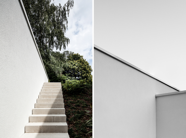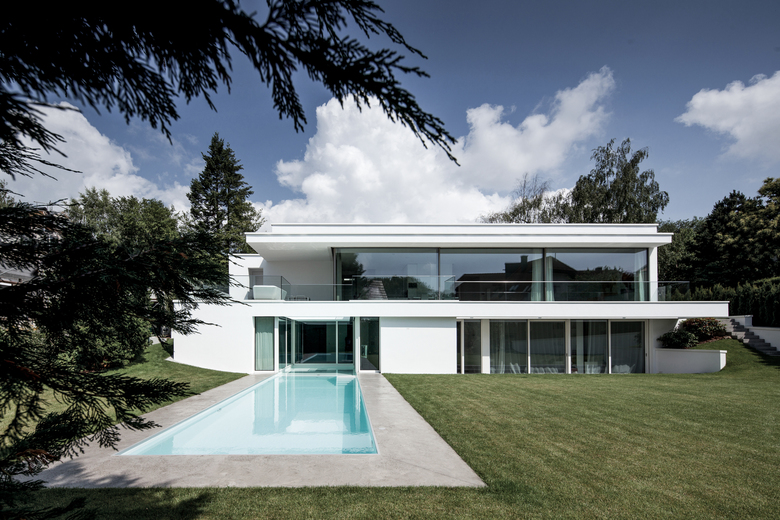 So entstand ein radikales und kompromissloses Spiel zwischen Öffnen und Schließen. Eine konsequente Geschlossenheit zeigt der minimalistische Baukörper zur Straße hin, zu der er sich einzig durch die Haustüre und die Garage öffnet und somit die Privatsphäre der Bauherren schützt und behütet. Offenheit und Transparenz dagegen prägen das Gebäude zum Garten hin, wo eine 18 m lange Highend-Glasfassade den Blick in die Natur und den Pool freigibt.