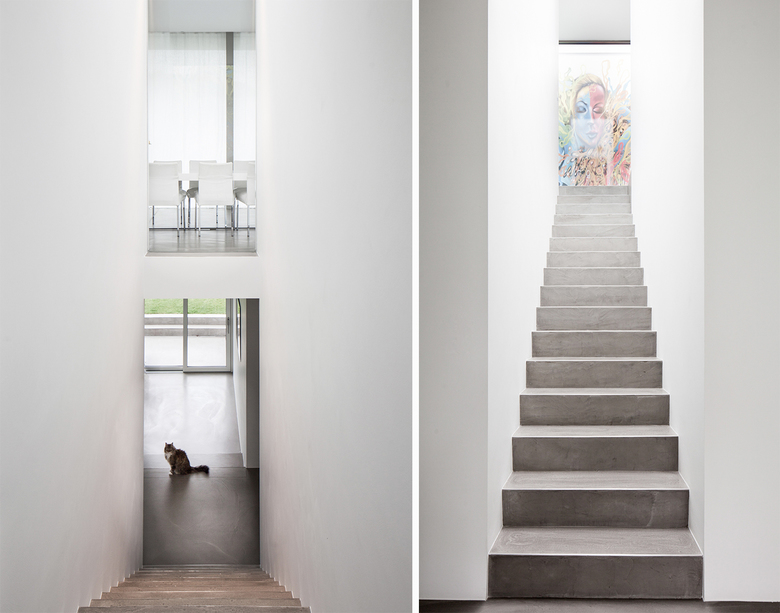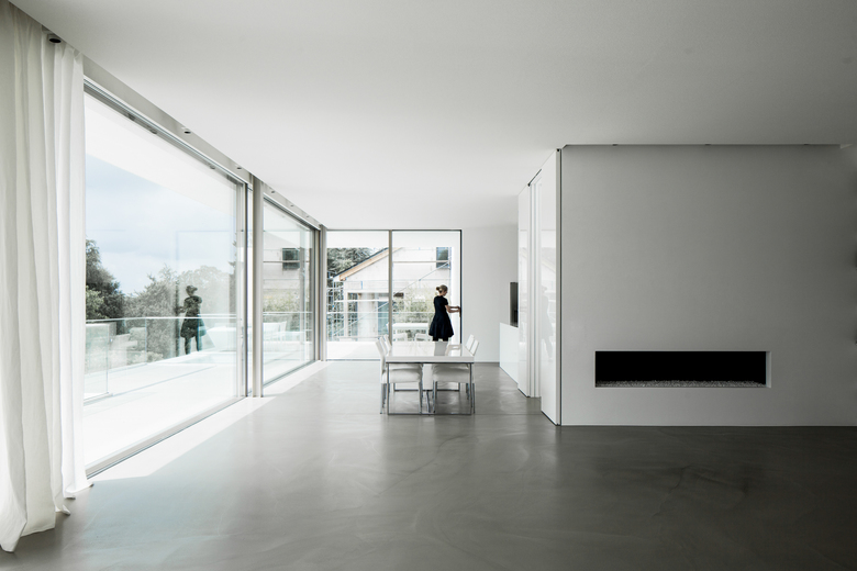 Von dort aus geht es weiter in einen weitgespannten, loftartigen Bereich, der Essen und Kochen beherbergt und über die imposante Fensterfassade den Blick auf Garten und Pool freigibt. Bis zu 18 m² große Panorama-Schiebefenster wurden schwellenlos in die Fassade integriert. Das großzügige Loft-Feeling wird von dem auf die Terrassen durchlaufenden Sichtbetonboden zusätzlich unterstrichen. Es zeigt sich der puristische Wohnstil, dessen Ambiente durch wenige, hochwertige Möbelstücke bereichert wird: Ein Sofa in der Ecke, ein weißer Tisch, ausgewählte Kunstwerke.