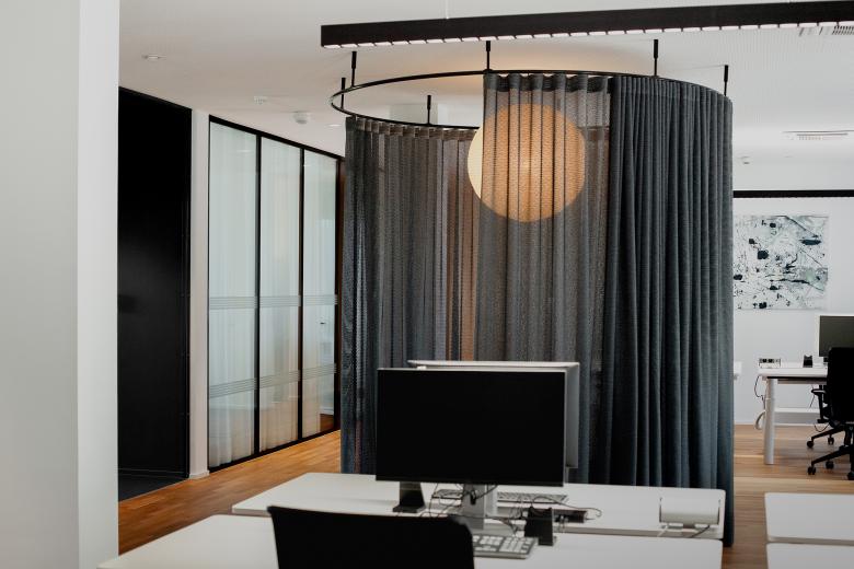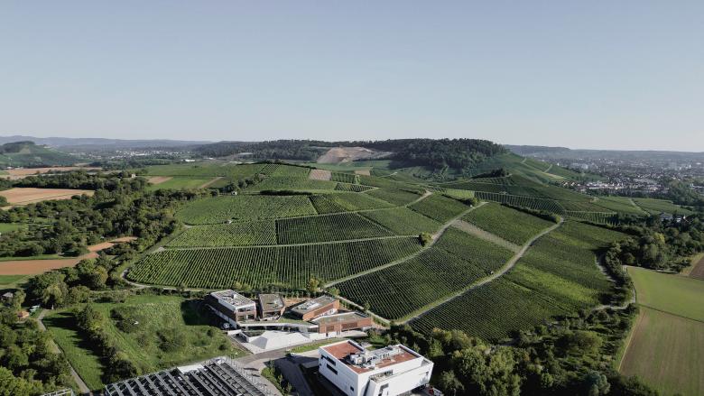 "New Work" is a top priority at the new headquarters, and so special attention was paid to the interior fittings and design: Spaciously designed group and open-plan offices are complemented by smaller office units and individual offices for the executive suite and the accounting department. Numerous meeting zones and flexible team areas complement the diverse room programme and offer employees countless possibilities for working depending on the situation: From the telephone booth as an absolute, noiseless retreat, to the Alcove Highback Work chair developed for Vitra as a single-work station in the large room, to so-called face-to-face rooms that can be separated in a circle with a curtain, the headquarters has a lot to offer in addition to classic conference rooms. Floor coverings and individual fixtures made of wood, together with various textile elements in the form of curtains, carpets and room dividers, create a homely atmosphere. The view of the unique backdrop of the vineyards is omnipresent.