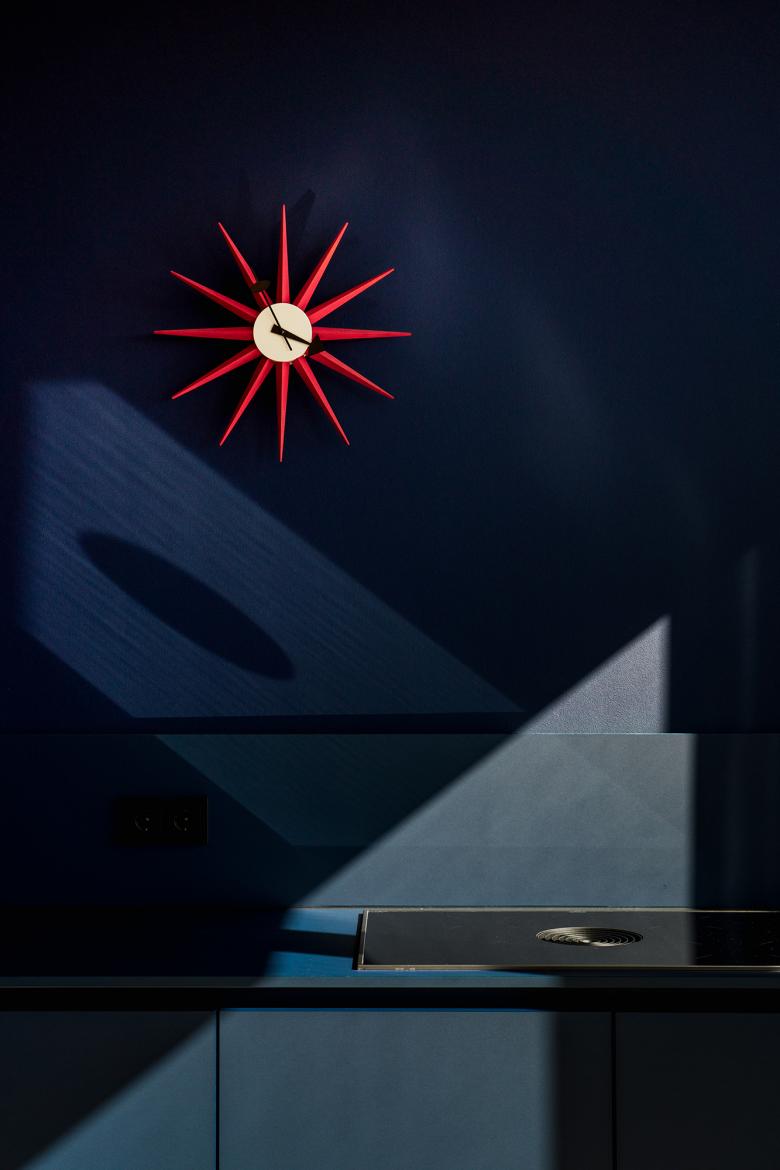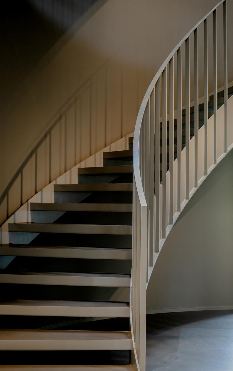 A large interior planting bed marks the transition to the building part of XEPTUM Consulting AG, the entrances to the four fingers themselves are defined by wood-panelled portals, which sometimes lead at ground level and sometimes via wooden steps to the respective company wings. Each wing is self-sufficient and connected to the communal underground car park via staircases painted golden green. The other ancillary rooms - such as wet rooms and cloakroom areas - were also designed to be architecturally and colourfully appealing. In addition to various shades of green, a dark blue - XEPTUM's corporate colour - repeatedly appears in the interiors. Various natural but also coloured woods together with black and white tiles and red eye-catching furniture round off the potpourri. The highlight of the three-storey wing of XEPTUM Consulting AG is the semi-circular curved steel staircase painted green, which winds upwards in the stairwell of the same colour and is covered and naturally lit by a huge dome light.