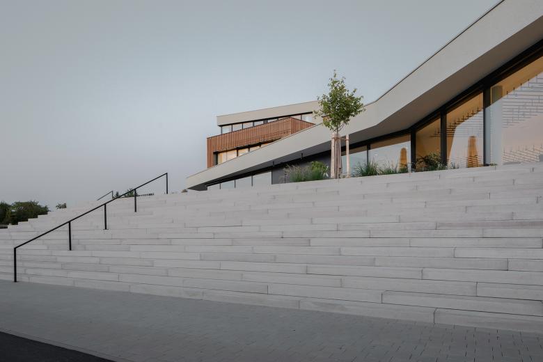 The urban location of the building site could not be more challenging: a beautiful scenery characterised by vineyards on one side and an efficiency-driven commercial architectural landscape on the other. Aware of these surroundings, the new office building for the Neckarsulm-based IT company bridges the gap between nature and industry, subtly creating a harmonious transition between these two extremes: With four fingers extending from a central foyer facing the industrial area far into the vineyards, the building interlocks with the surrounding natural space. At the same time, a multitude of natural open spaces are spanned between the individual wings and at the edges of the site: Trees, bushes and native plants settle on the slopes gently rising towards the vineyards and line the terraces. The roofs are also greened and equipped with a photovoltaic system.