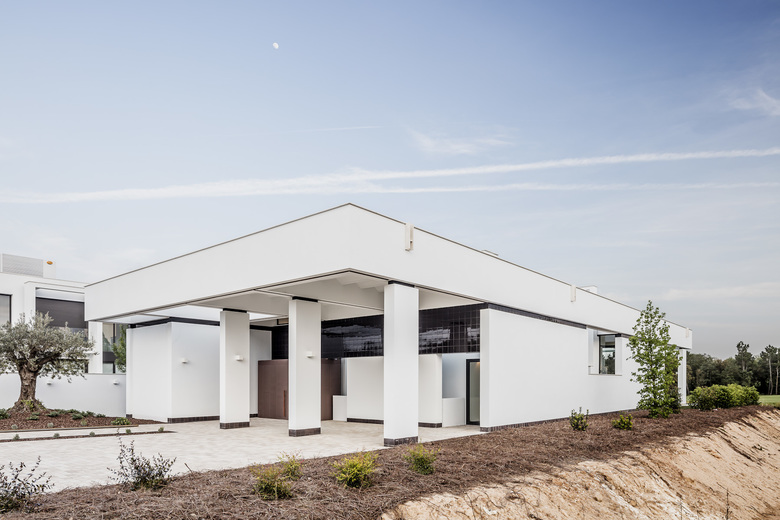 The materiality of the house is subordinated to the roof structure. A white painted concrete cantilevered surface gives character to the building. It is ramified in beams and vaults, and floats four meters above the ground floor plant. Beneath this element, a mat-building system connects to the ground, with local ceramic tiling and rendered walls. Timeless traditional materials are combined with modern glazed surfaces around the courtyards.