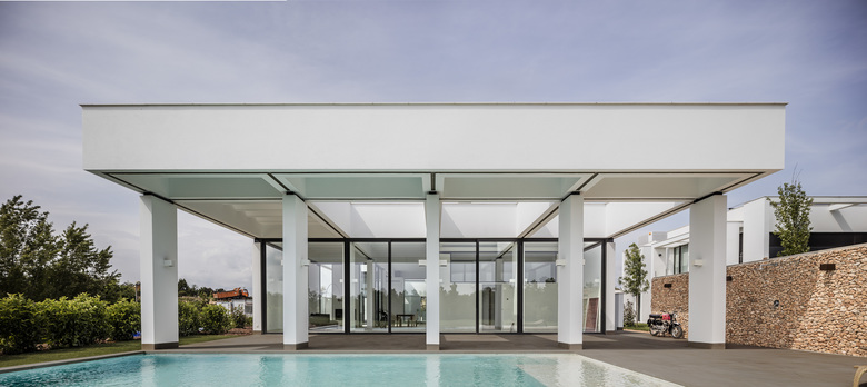 Inside, the initially isotropic and aligned structure is organised by three courtyards. The resulting subspaces are occupied by the different common areas of the house: kitchen, dining and living rooms. Each courtyard is an external extension of the annexed living areas. The remaining fourth vane is reserved to the bedrooms wing.