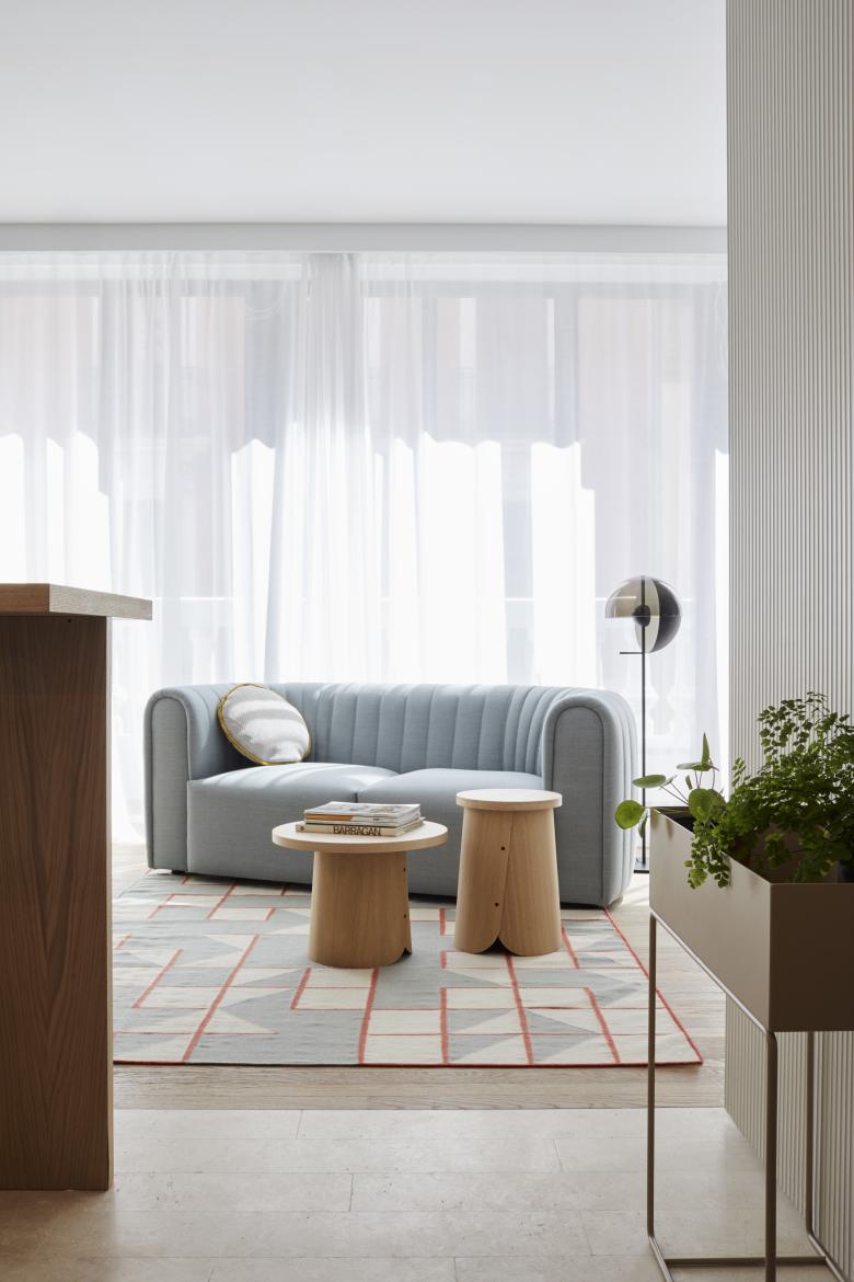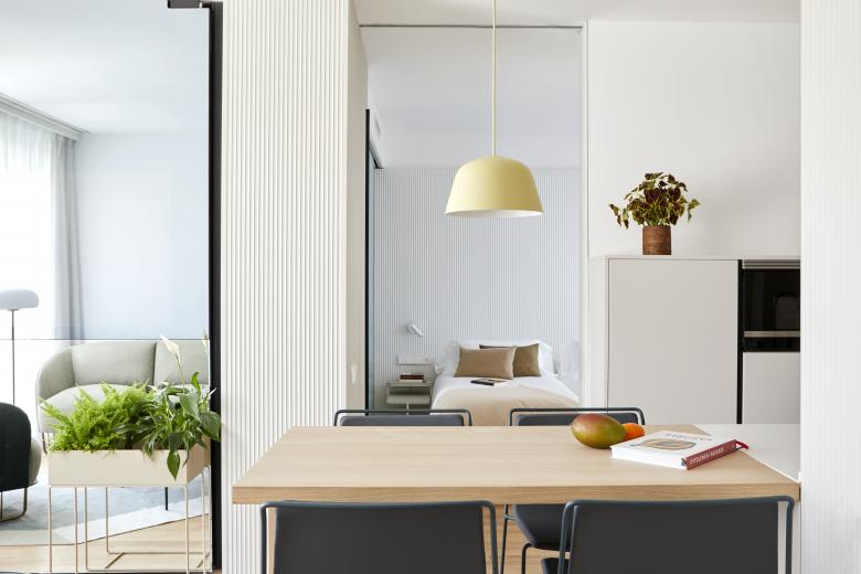 Los apartamentos tienen distintas configuraciones en función de las necesidades y cuentan con un interiorismo diferenciado entre sí, con mobiliario de diseño. Grandes ventanales inundan de luz natural las estancias en las que predominan materiales sencillos y nobles, texturas naturales, tonos blancos y arenas de fondo con aplicaciones puntuales de color. Pocos muebles de formas simples y suaves, cuidadosamente seleccionados. Luces bajas, indirectas y regulables que crean espacios acogedores. Sofás y butacas curvilíneos, sobrios y elegantes.