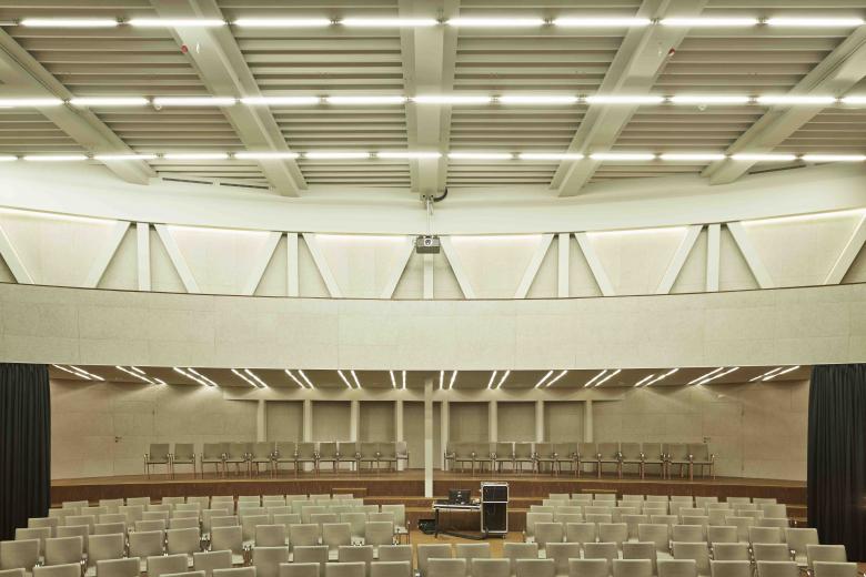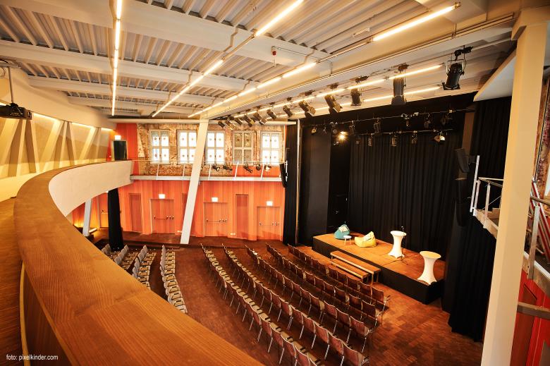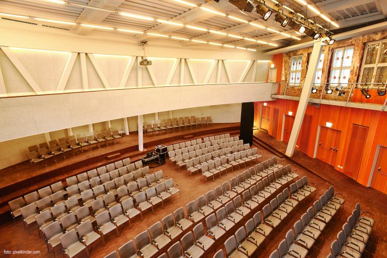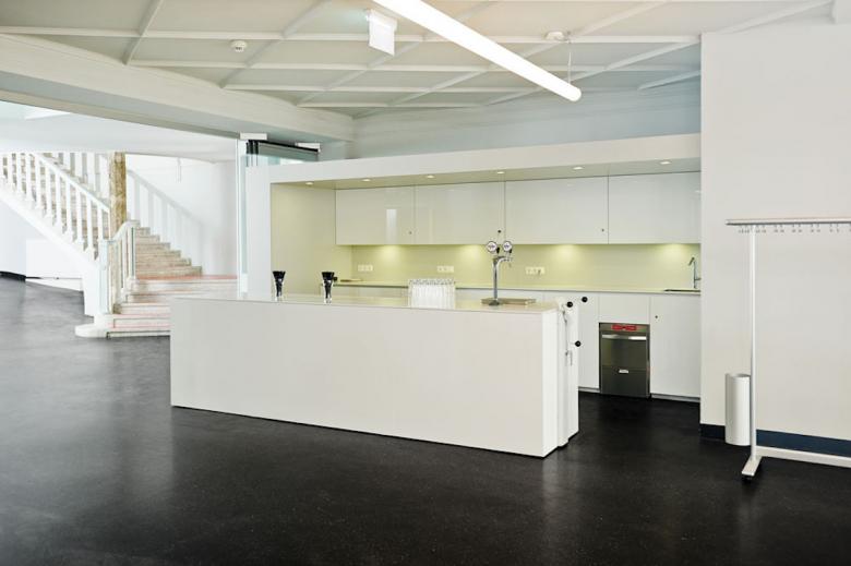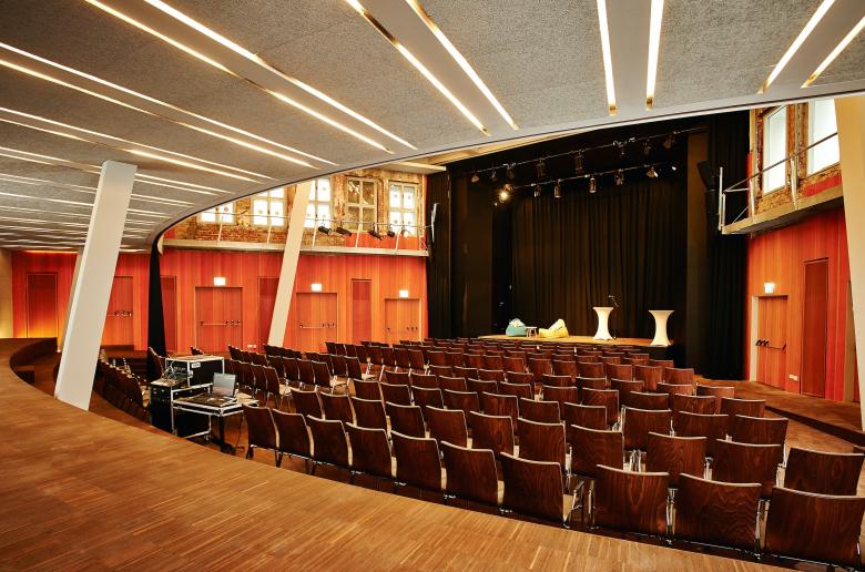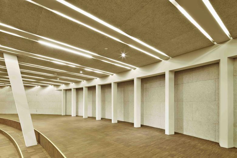 Der Saal der ursprünglich mit einer Holzkonstruktion überbaut war, wurde mit einer massiven Deckenkonstruktion überspannt.