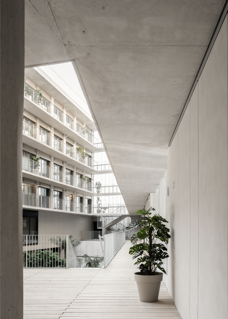 Het gebouw ontplooit zich rondom een centrale groene patio die ervoor zorgt dat daglicht tot diep het gebouw kan binnendringen. De patio reikt tot niveau -1. De binnentuin schermt de bewoners af van het lawaai van de stad. Opgelegde ruimtelijke beperkingen werden omgezet in kwaliteiten. Een uitkraging op de tweede verdieping garandeert een vloeiende uitlijning van de gebouwen langs de Ronda Litoral. Een gearticuleerd gebouw met een imposante plint ontstaat. Gelimiteerde bouwhoogte resulteert in een dakterras. Interessante dwarsdoorsneden met een ruime variatie aan horizontale, verticale en diagonale perspectieven worden gecreëerd.