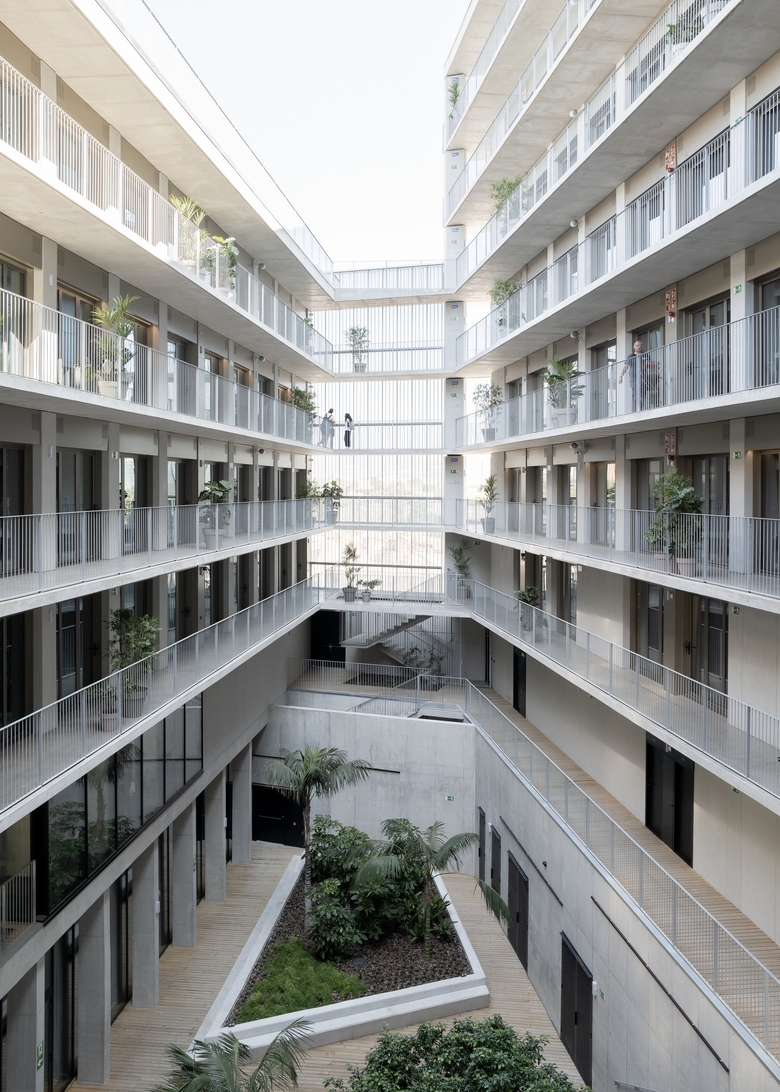 De residentie bevat 191 woonunits die worden bereikt via buitengangen die zich rondom de patio bevinden en tevens dienen als terrassen voor de units. De strategische locatie van de sanitaire voorzieningen deelt de compacte kamers op in verschillende ruimtes met zichten op zowel de centrale patio als op de straatzijde. Beweegbare zonneschermen aan de buitengevel doorbreken het repetitief karakter van studentenunits.