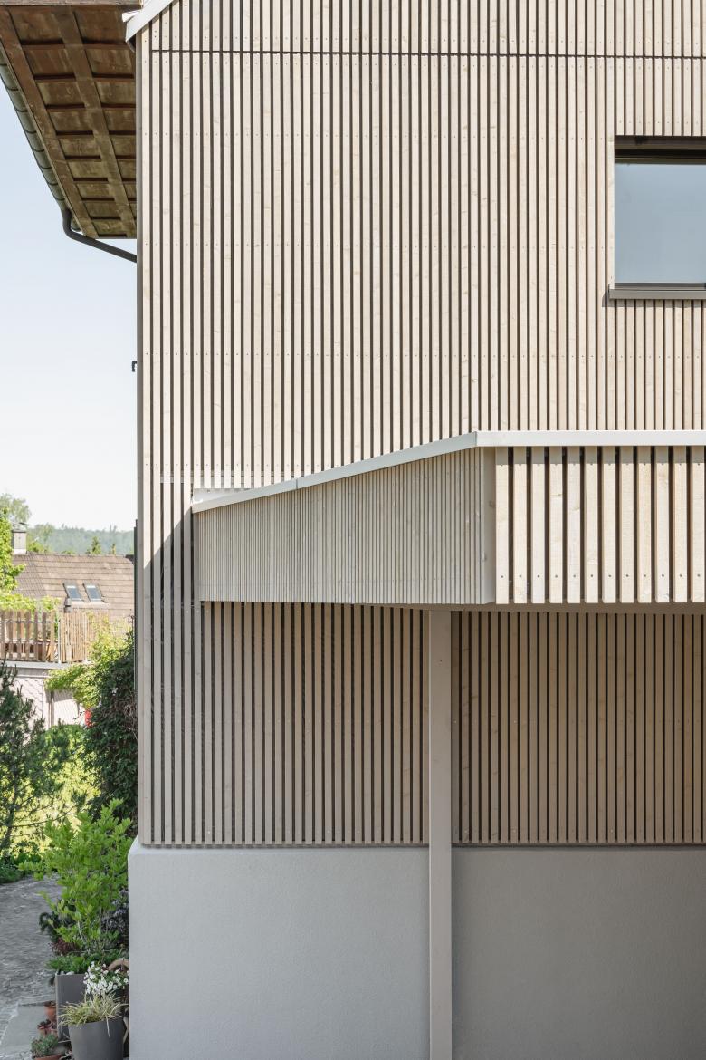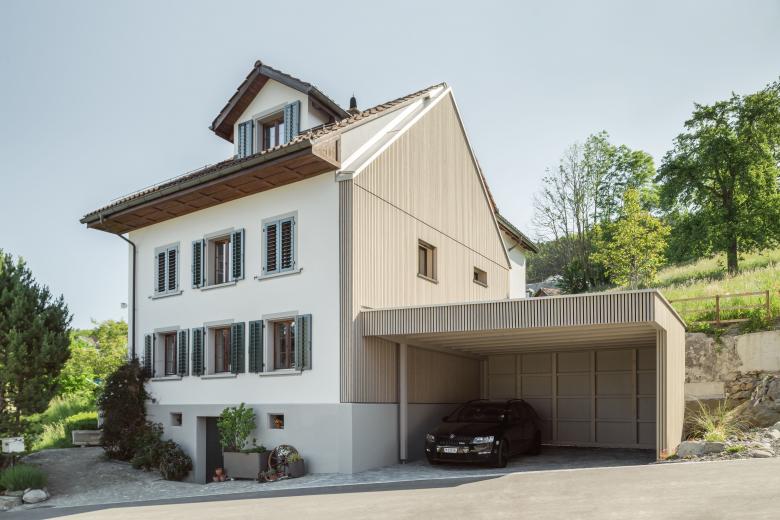 Beim einem historischen Bauernhaus wurde ein angebautes Gebäude abgerissen. Die Bauherrschaft wünschte eine neue Fassade und einen Carport. So wurde die entstandene Fassadenfläche als eigenes Volumen inszeniert und bekam eine neue Ausstrahlung. Die feine Holzstruktur wirkt lebendig und gibt dem Ort eine Referenz an das Gewesene.