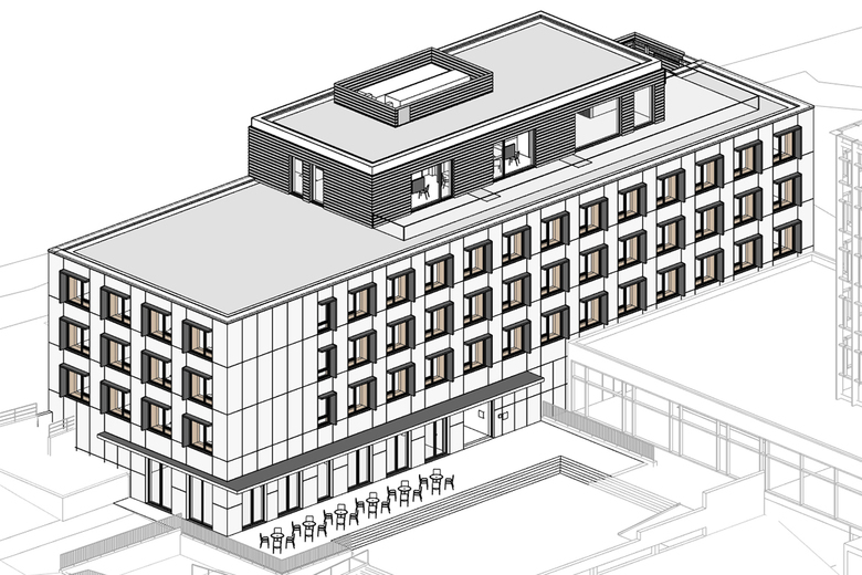 Durch den Neubau des Hotels entsteht ein Gebäude, das neben dem Rathaus Oberkochen respektvoll aber selbstbewusst existiert und mit den vorhandenen Bausteinen wieder ein Ensemble bildet. Seit Beginn der Entwurfsplanung arbeitet str.ucture zusammen mit arch22 an einem gemeinsamen Revit Building Information Model (BIM), wodurch das Architekturmodell und das Tragwerksmodell stets auf dem aktuellsten Stand sind. Str.ucture unterstützt hier die Architekten nicht nur bei der Tragwerksplanung sondern auch bei der Pflege des gemeinsamen Modells und BIM Administration. Das Hybridtragwerk in Stahlbetonskelettbauweise mit tragenden Mauerwerksaußenwänden garantiert ein hohes Maß an Flexibilität. Des Weiteren wurde beim Tragwerksentwurf ein besonderer Schwerpunkt auf die Wirtschaftlichkeit gelegt. So wird die Tiefgarage in offener Bauweise mit Pflasterfahrbelag erstellt, was eine aufwändig beschichtete Bodenplatte erspart. Die Hangsicherungsmaßnahme wird zur Gründung des Hotels mit herangezogen.