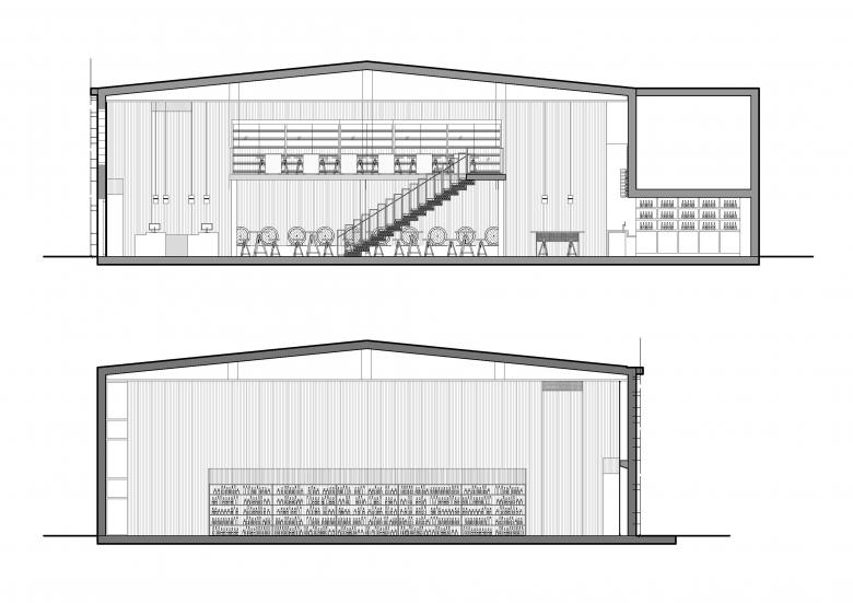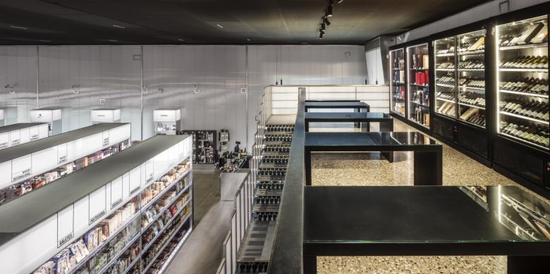 _ The Exhibition and sale area of liquors; a parallel succession of metal shelves that neutralize the space and allow to accentuate the product with a studied lighting.